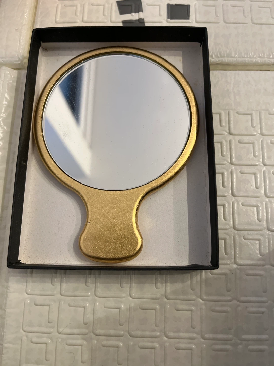 A vintage-style hand mirror with a decorative floral design in gold and pink tones. It's presented in a black box. This compact mirror is perfect for quick touch-ups on the go!