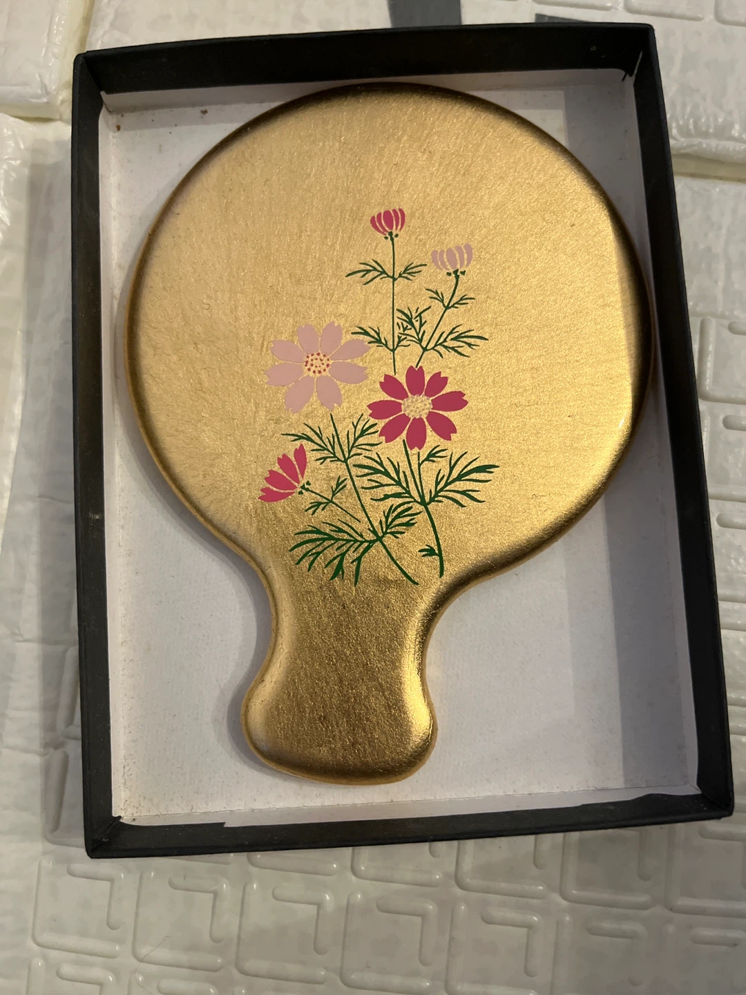 A vintage-style hand mirror with a decorative floral design in gold and pink tones. It's presented in a black box. This compact mirror is perfect for quick touch-ups on the go!