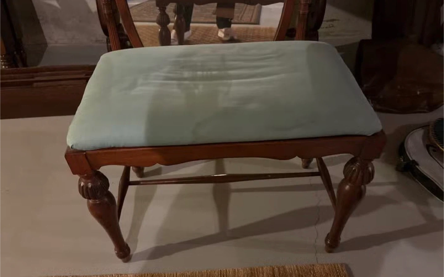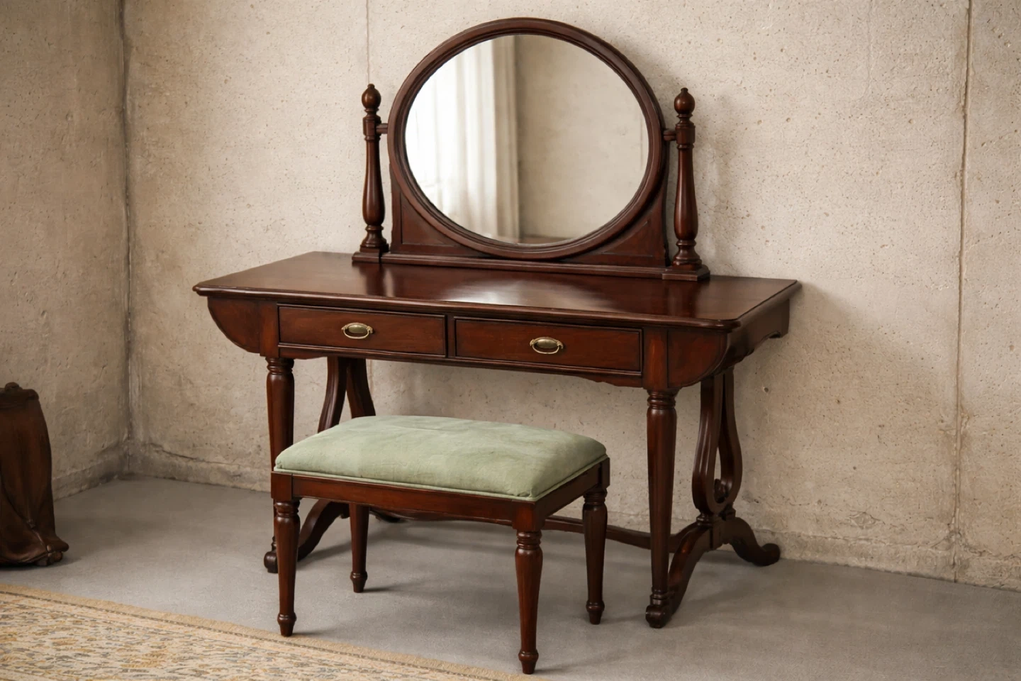 Dark wood drop-leaf vanity table with 2 drawers and matching mirror (detached). Bench with green fabric seat. Bring appropriate vehicle. Located in basement.