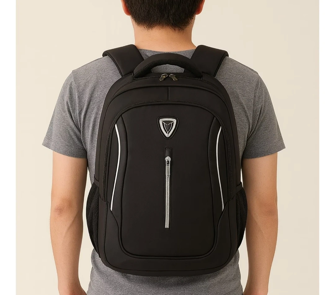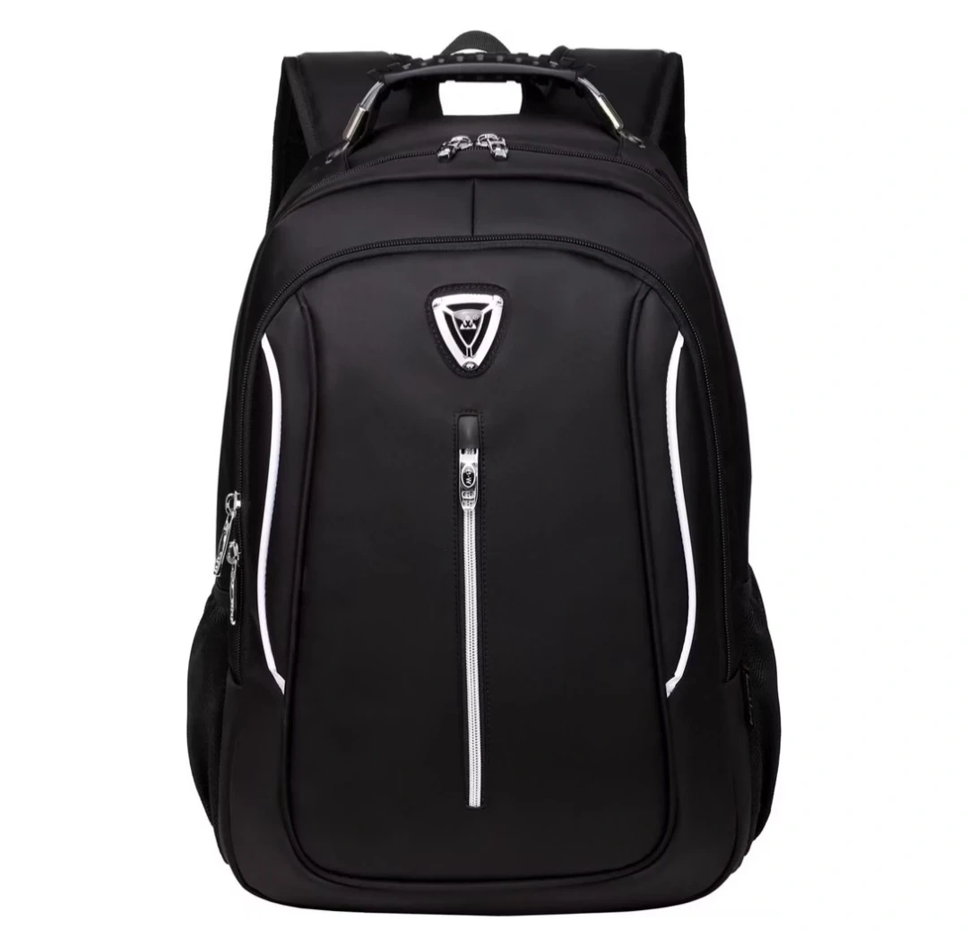 This is a black backpack with stylish white piping along the front. It features a main zippered compartment and multiple external pockets, including mesh side pockets. The padded shoulder straps offer comfort for carrying.