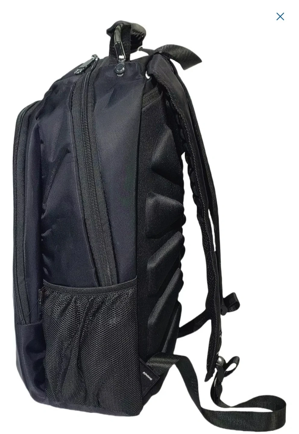 This is a black backpack with stylish white piping along the front. It features a main zippered compartment and multiple external pockets, including mesh side pockets. The padded shoulder straps offer comfort for carrying.