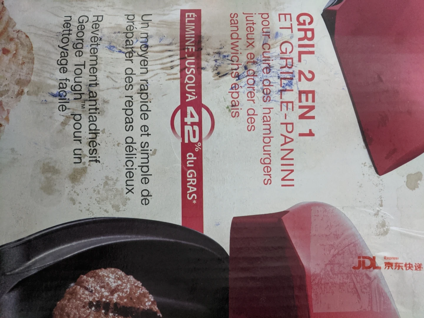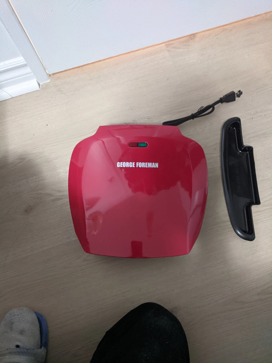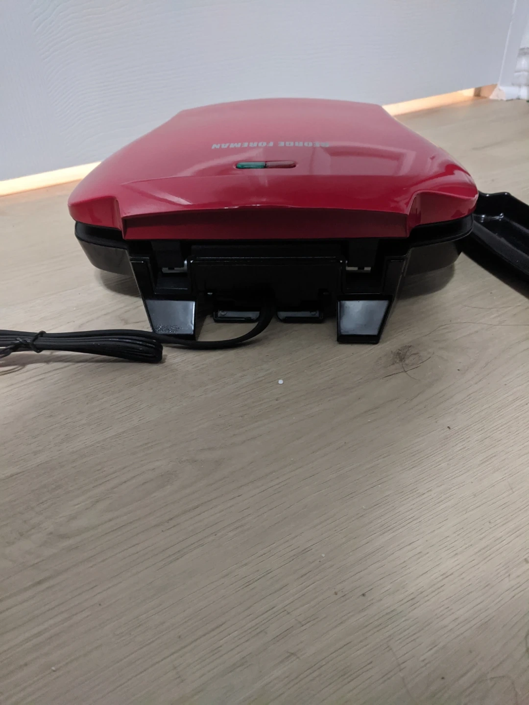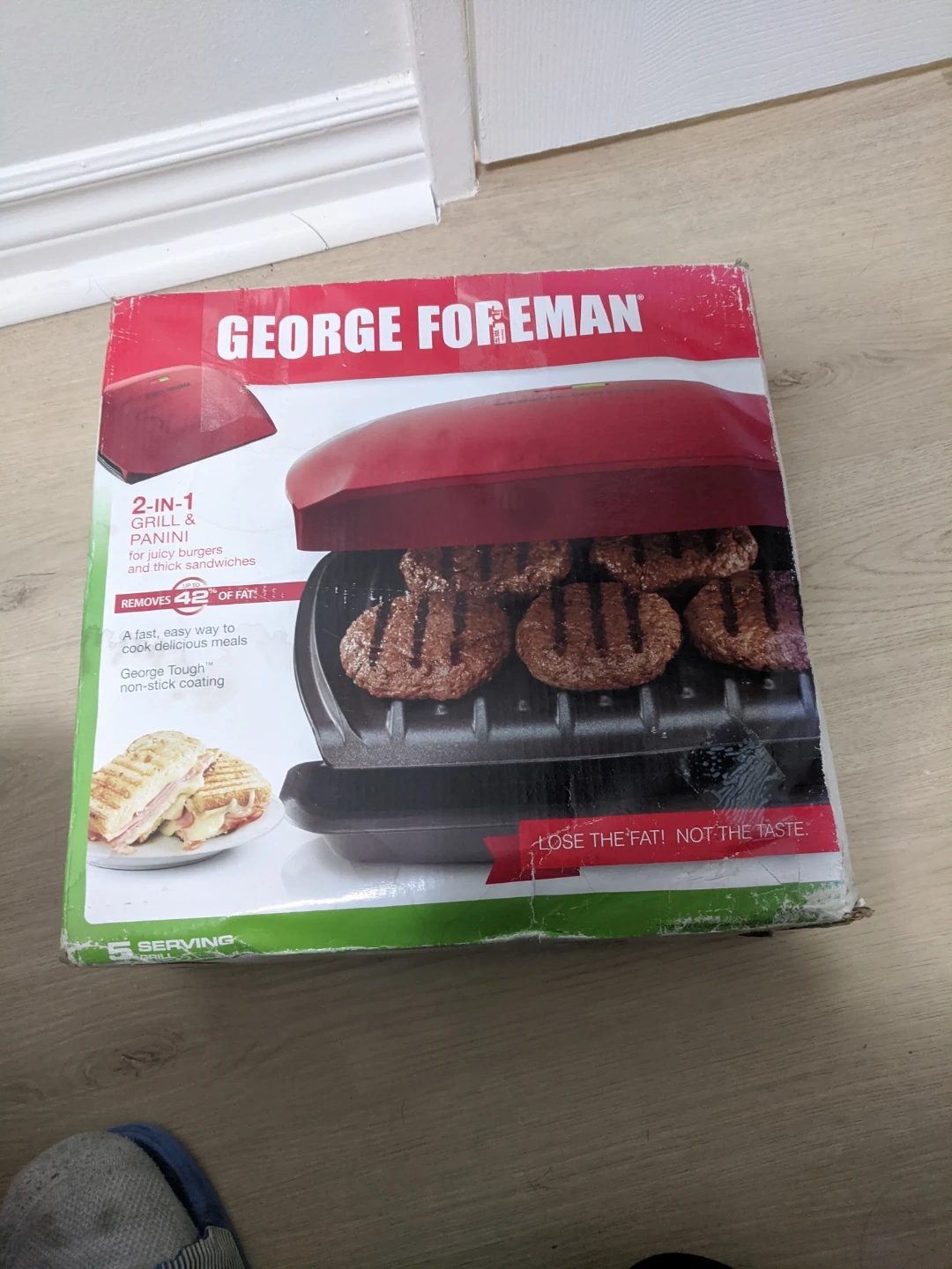 This is a George Foreman 5-serving grill and panini press. It features a non-stick George Tough coating for easy cleanup. It's red and comes with the instruction manual. Pick up at 195 Merton Street Toronto or pick up at subway station Davisvill. And I can deliver it to your house but you need to pay me another $3. Thanks.