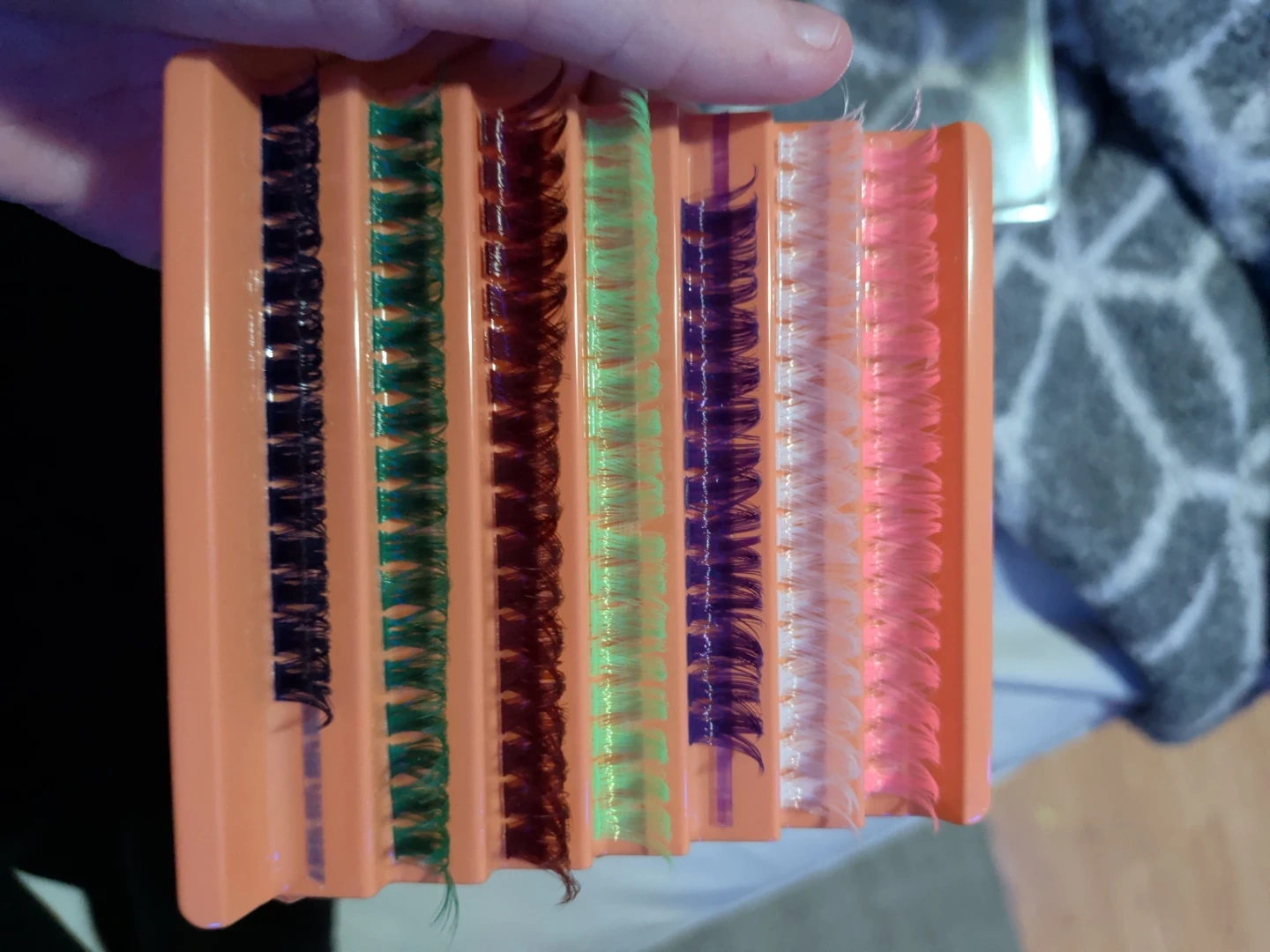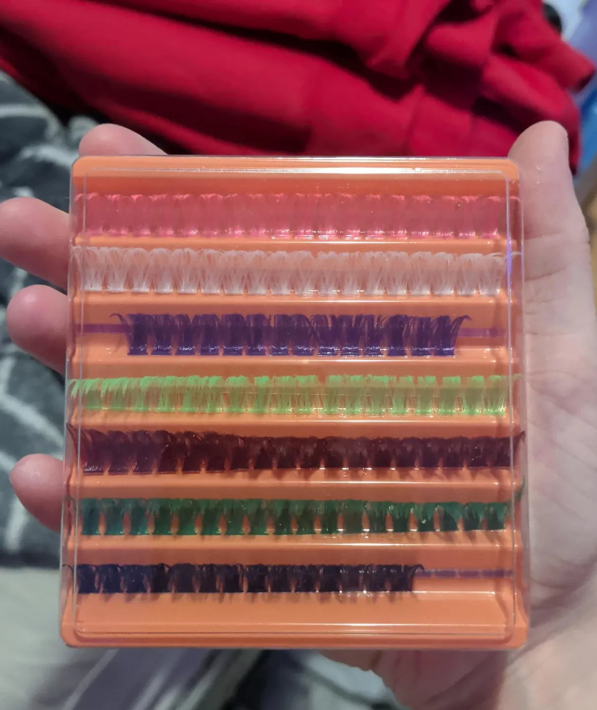 This tray includes multiple rows of assorted colour false eyelashes. They come in a convenient orange case for easy storage and selection. Colours include black, dark green, brown, light green, purple, white, and pink.