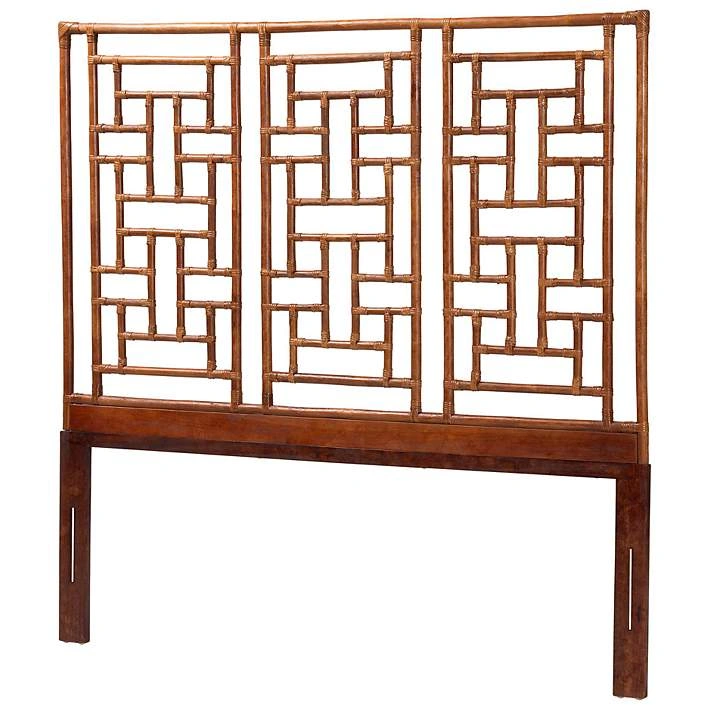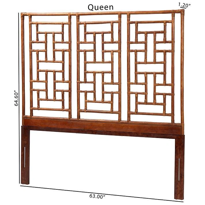 This headboard features a unique geometric bamboo design with a wooden frame. It's designed for a Queen size bed. Measures 63" wide by 64.60" tall with a depth of 1.20".