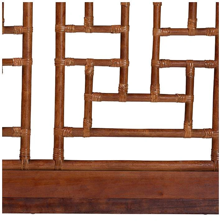 This headboard features a unique geometric bamboo design with a wooden frame. It's designed for a Queen size bed. Measures 63" wide by 64.60" tall with a depth of 1.20".