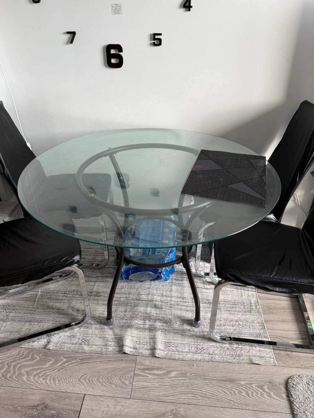Round glass top dining table with a dark metal base. Perfect for a small dining area or kitchen nook!