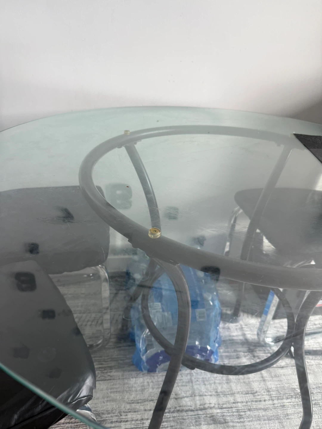 Round glass top dining table with a dark metal base. Perfect for a small dining area or kitchen nook!