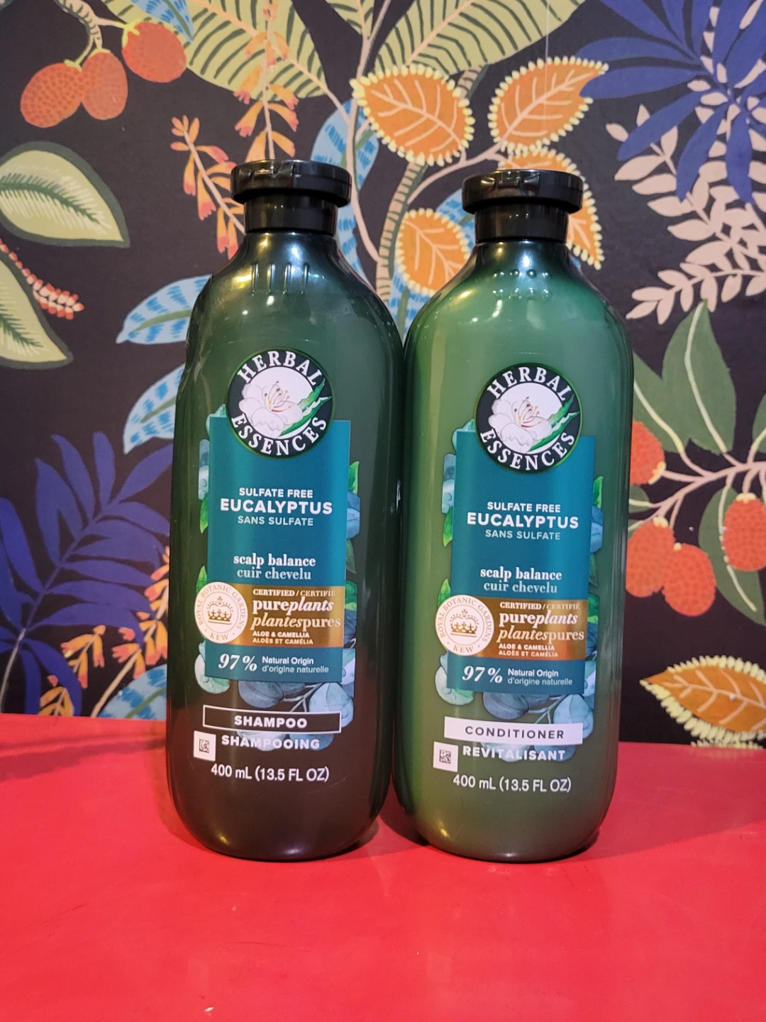 This set includes Herbal Essences sulphate free Eucalyptus shampoo and conditioner. Both bottles are 400 mL (13.5 FL OZ). They're designed for scalp balance, with 97% natural origin ingredients. New and never used.