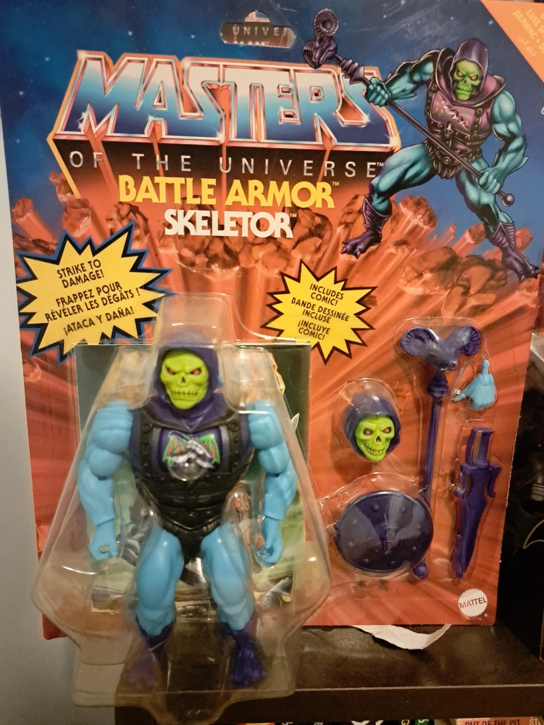 This is the Masters of the Universe Battle Armor Skeletor action figure. It includes a comic and comes in its original packaging. Get ready for some epic battles!