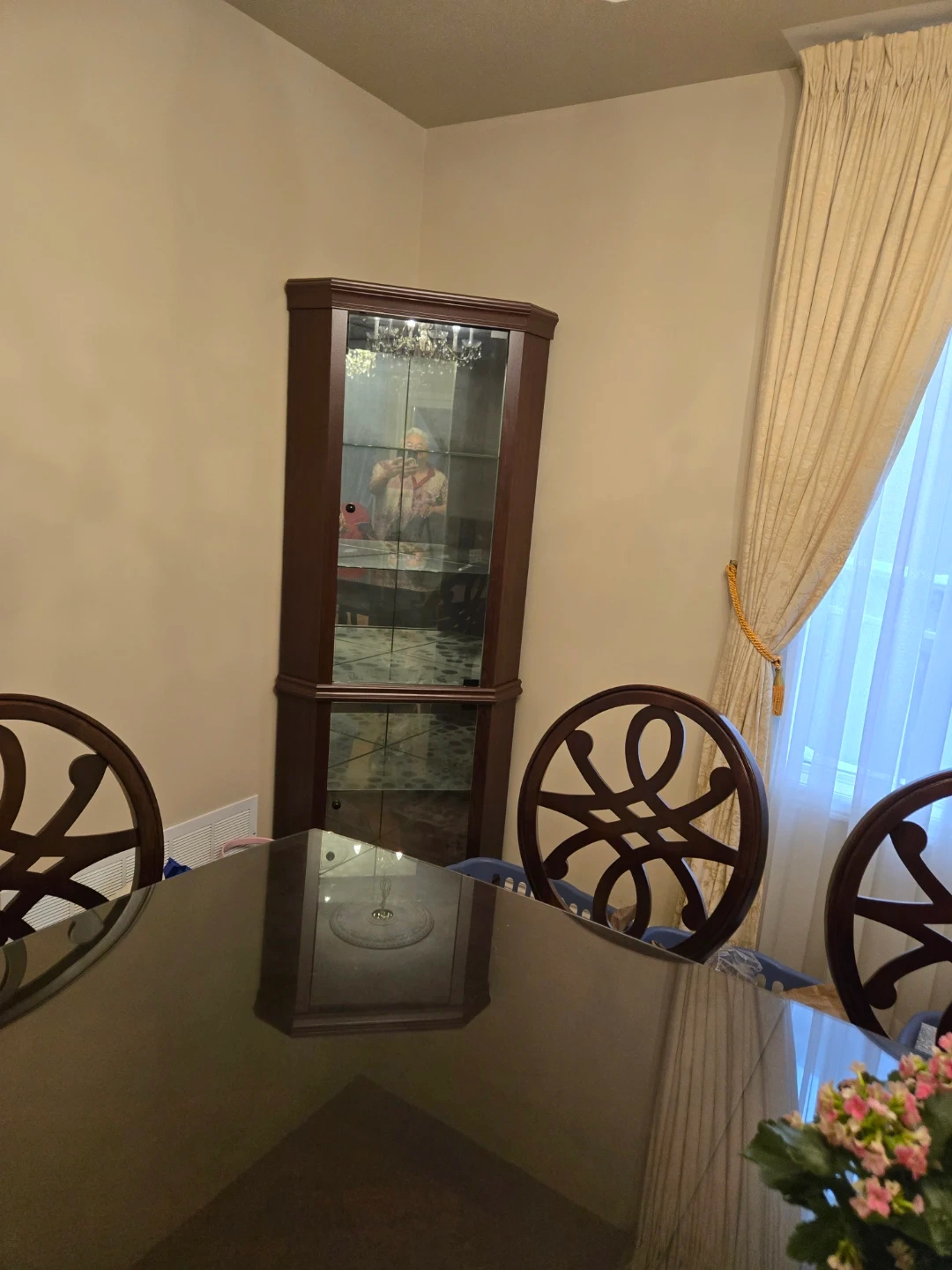This corner display cabinet is dark wood with mirrored backing and glass shelves. It's perfect for showcasing collectibles or dishware. Offers ample storage in a compact design!