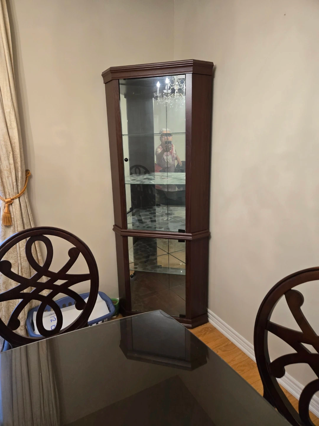 This corner display cabinet is dark wood with mirrored backing and glass shelves. It's perfect for showcasing collectibles or dishware. Offers ample storage in a compact design!