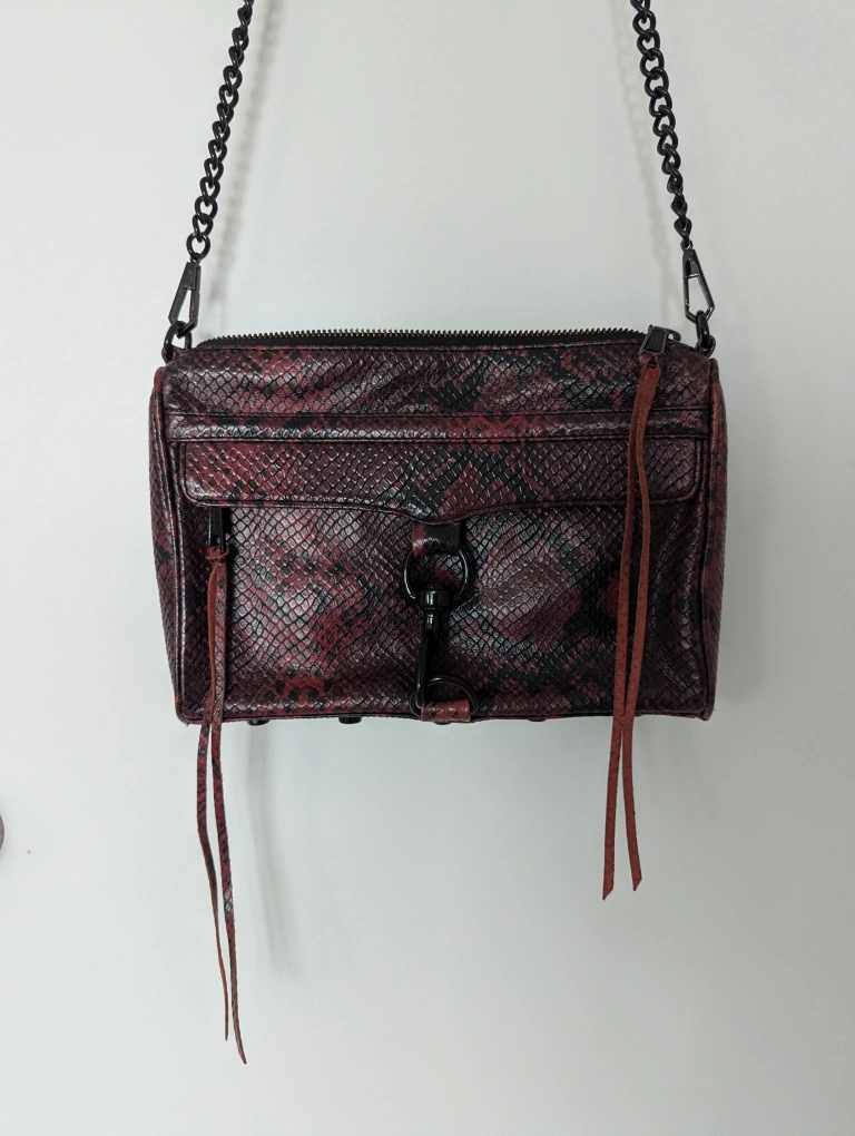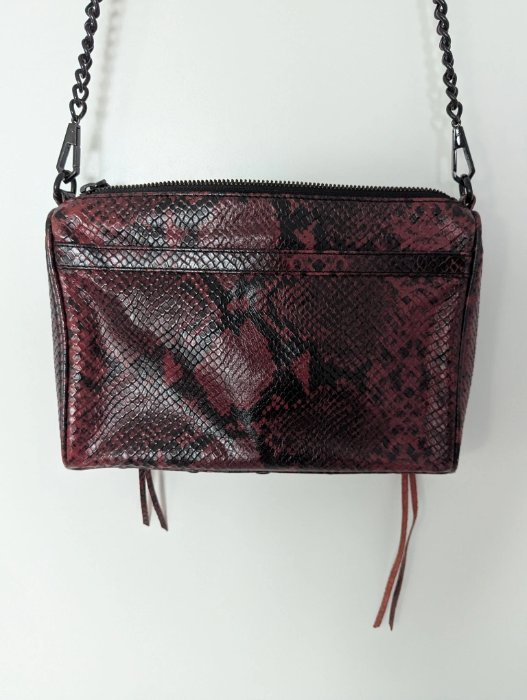 Elevate your style with this Rebecca Minkoff snakeskin leather crossbody bag, featuring a chic chain strap. This gently used bag is perfect for adding a touch of edgy sophistication to any outfit.