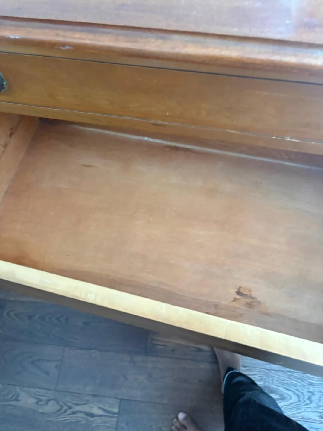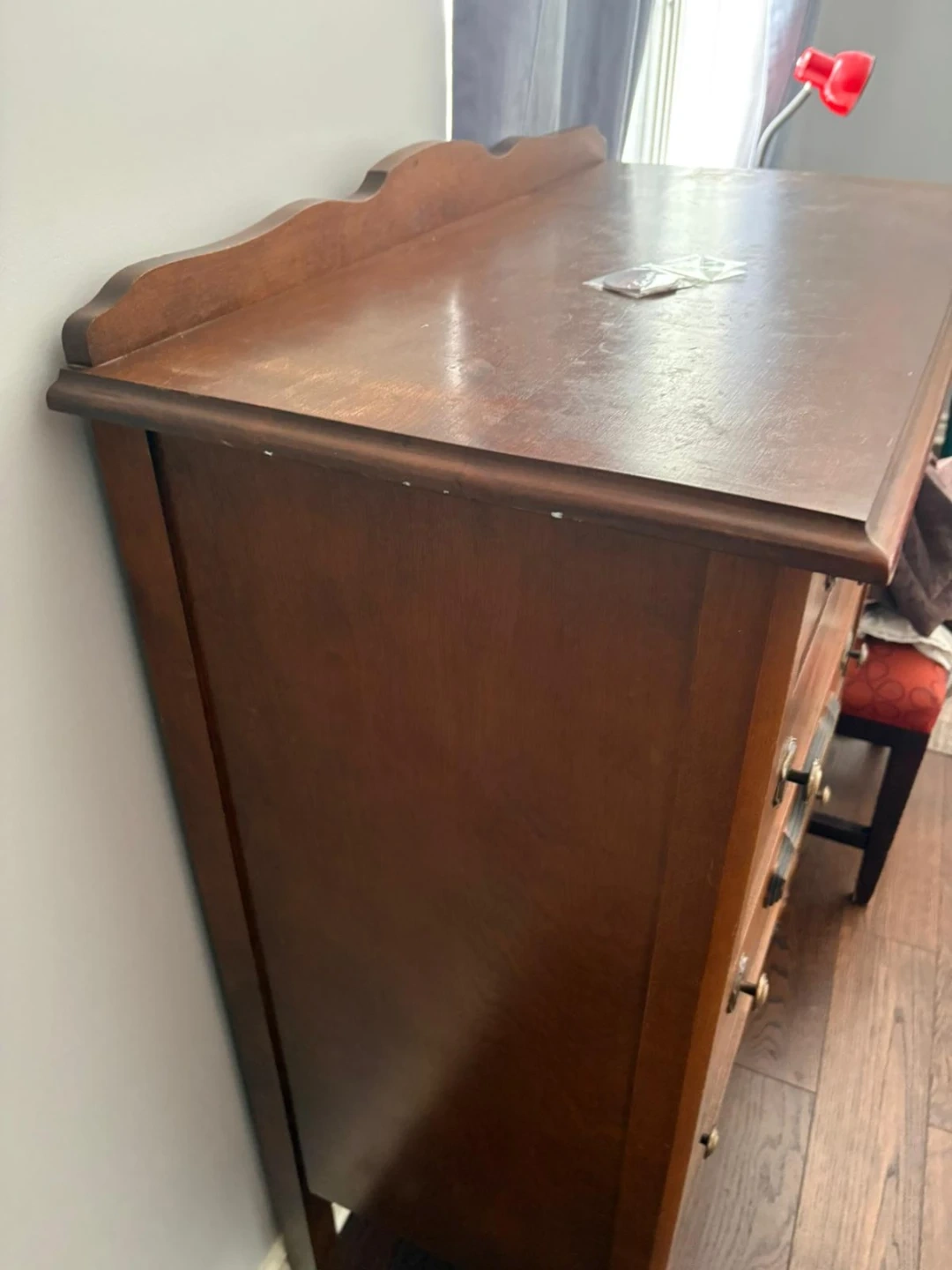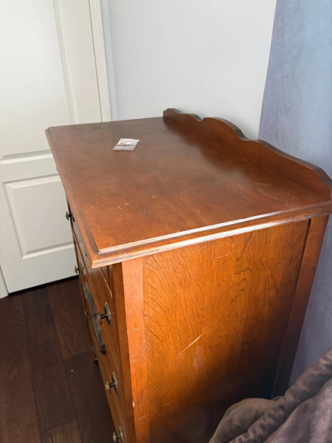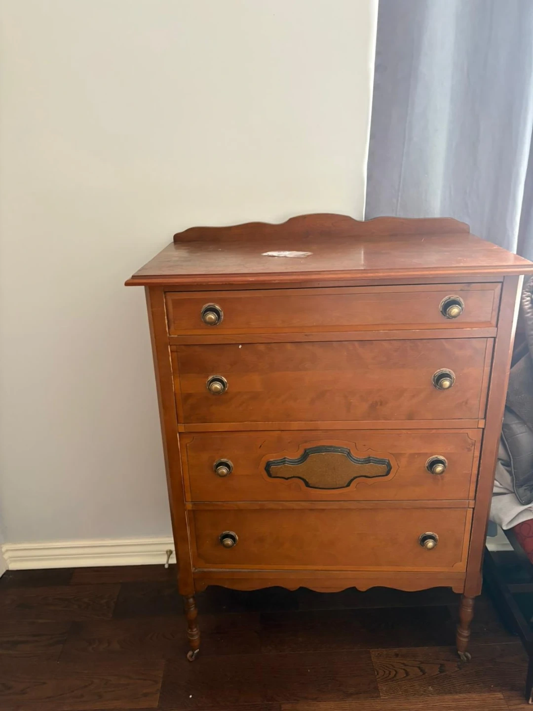 This is a vintage wooden dresser with four drawers. It's a warm brown wood tone and has decorative hardware. The drawers are spacious and a little rough around the edges. It'd be a nice addition to a bedroom or living space! A great restoration project for those DIY lovers.