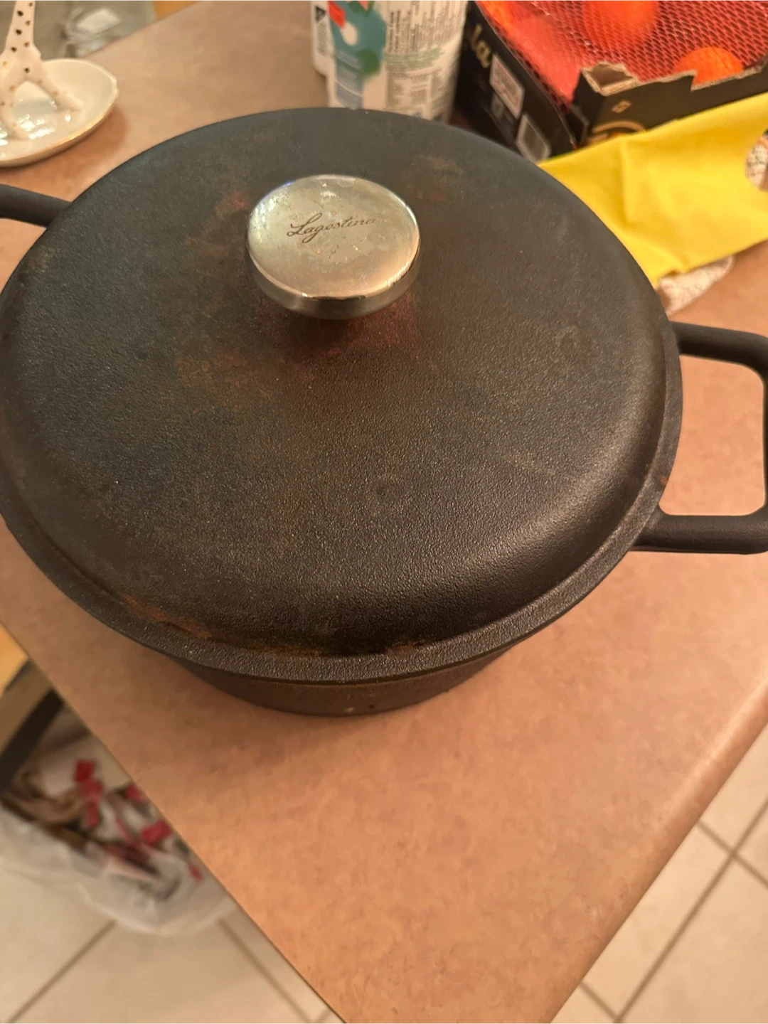 Selling a Lagostina cast iron Dutch oven. It's in good condition and ready for your next stew or roast! Could definitely use a proper clean. FYI it’s quite heavy