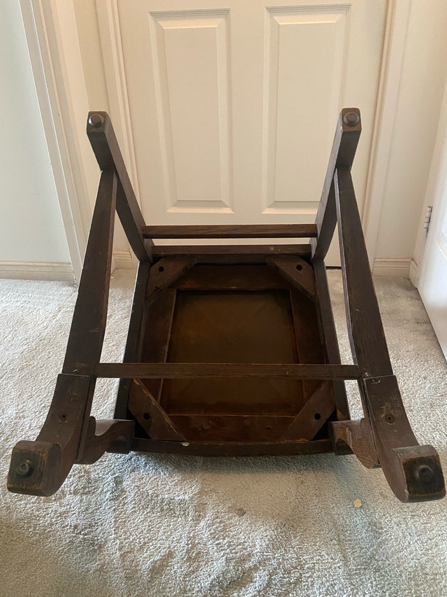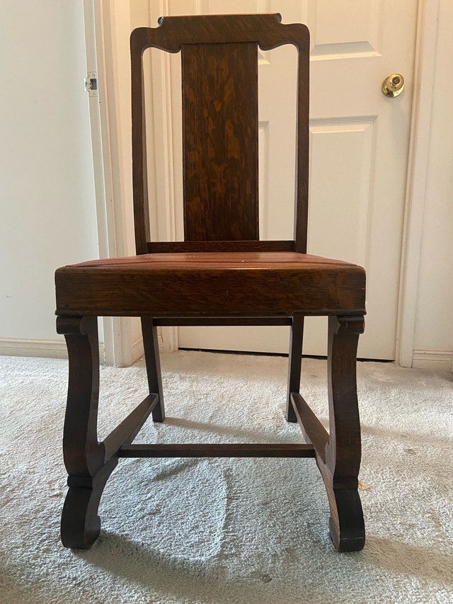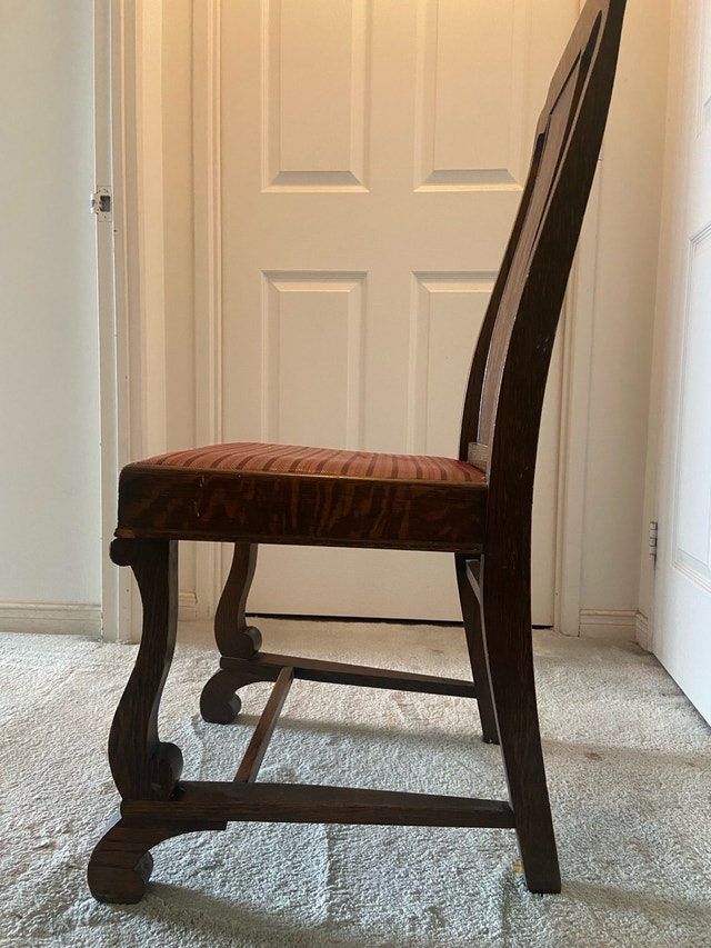 This is a set of 4 antique chairs with a unique design, perfect for adding character to any room. They are used chairs and have some wear, but are in good condition for their age. The chairs feature a sturdy wooden frame and a comfortable seat. They would look great in a living room, study, or bedroom.