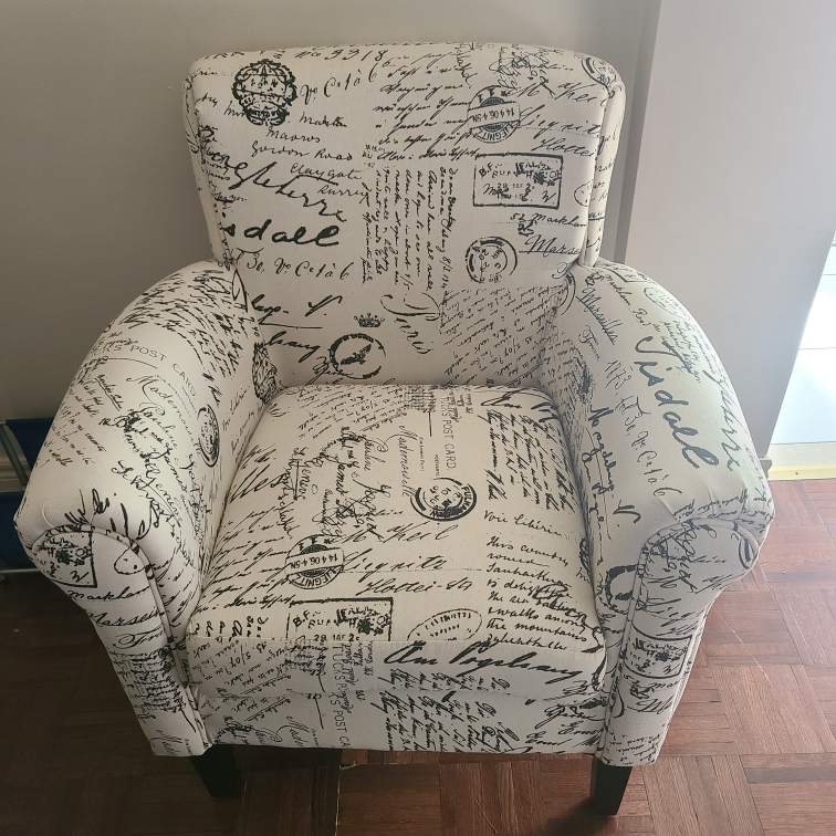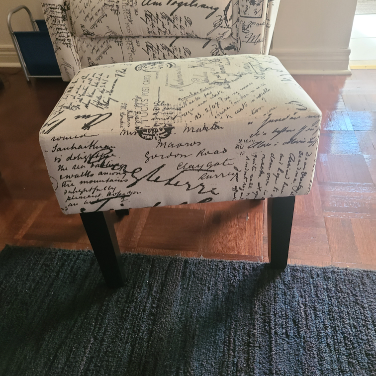 A comfortable armchair with an ottoman. The chair and ottoman have a white and black script fabric cover. The legs need fixing other than that in great condition.