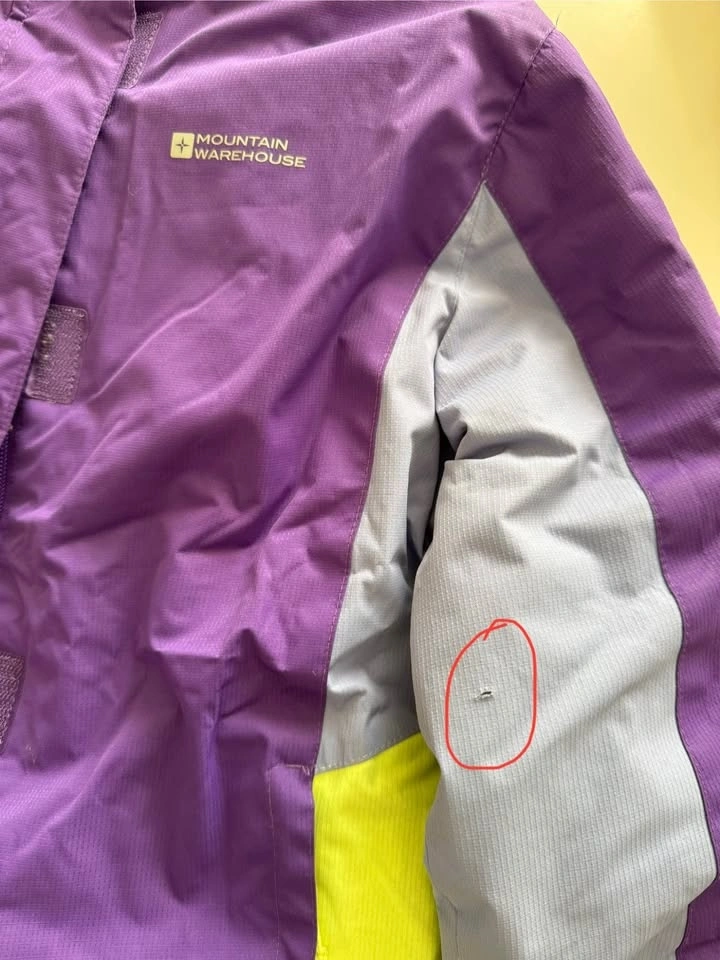 Colorful Mountain Warehouse ski suit for kids, includes jacket and snow pants with suspenders. Water-resistant fabric with reinforced panels. Size 11-12 years. Has minor wear: some pen marks on one side and a small rip on a sleeve (see photos), otherwise in great condition.