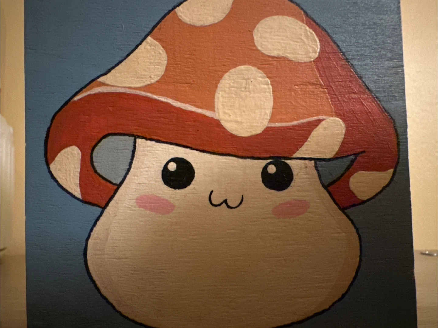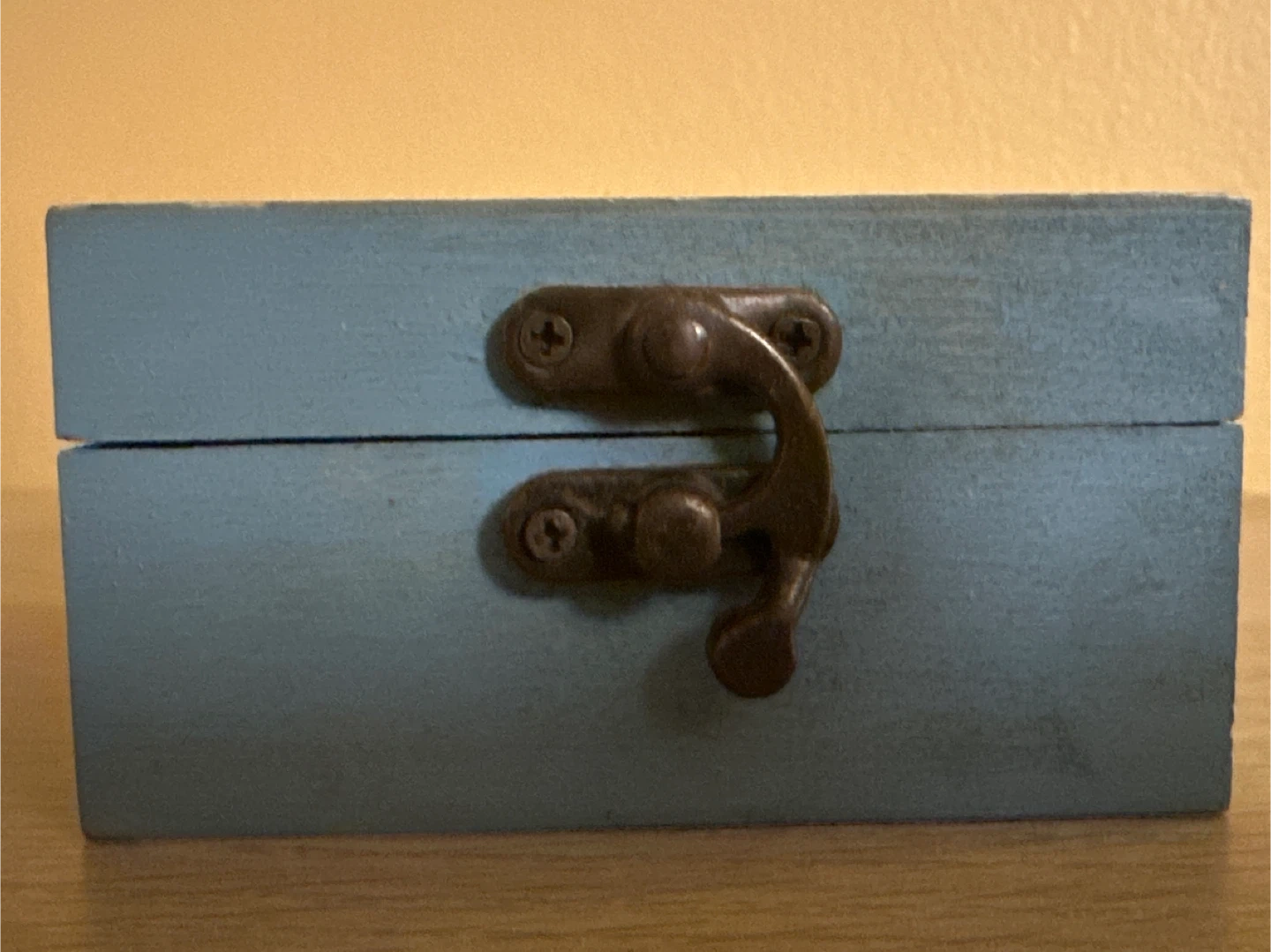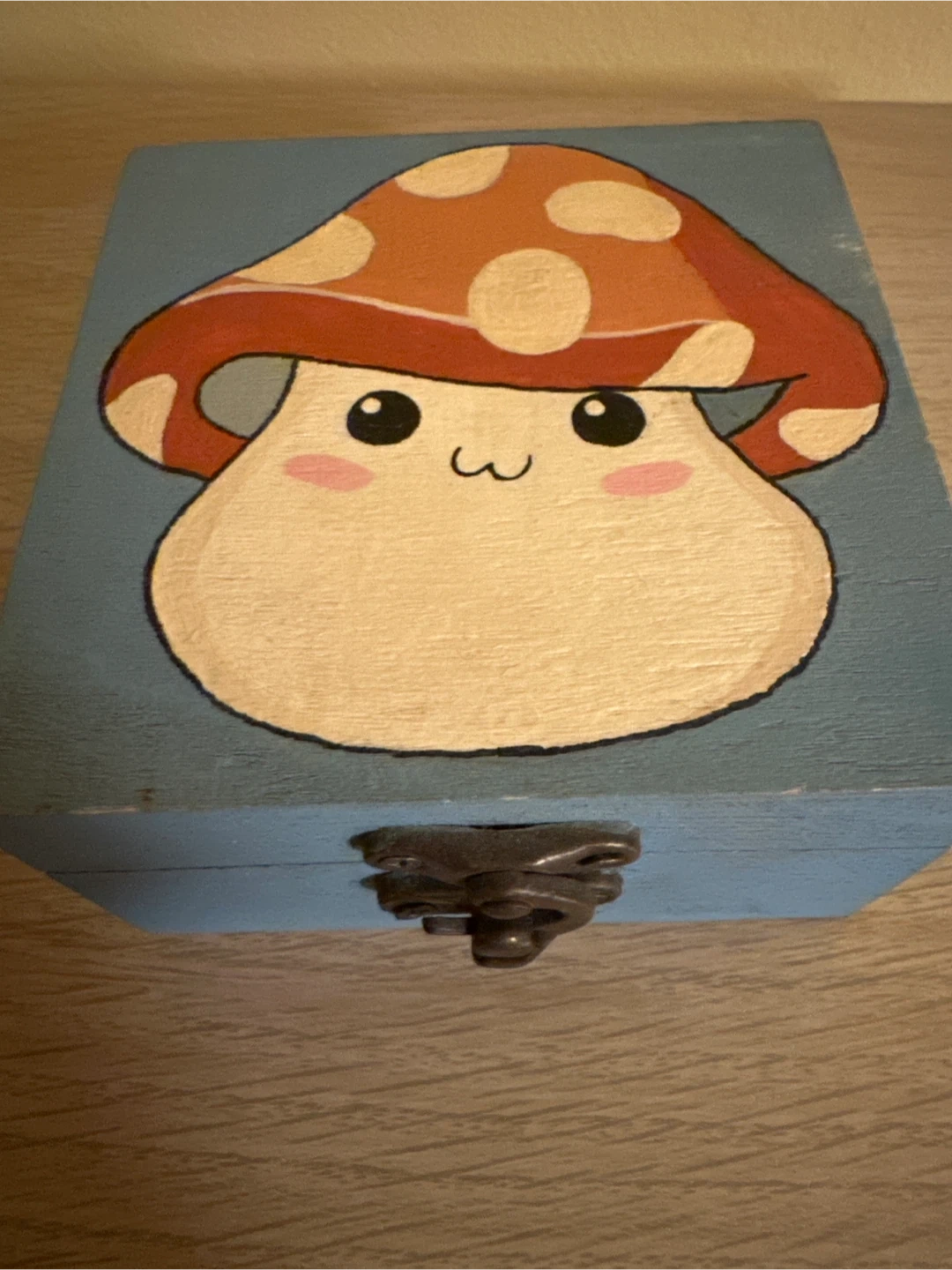 Cute wooden trinket box with a charming hand-painted mushroom design. It's painted a lovely sky blue and features a metal clasp closure. This small box is perfect for storing little treasures!