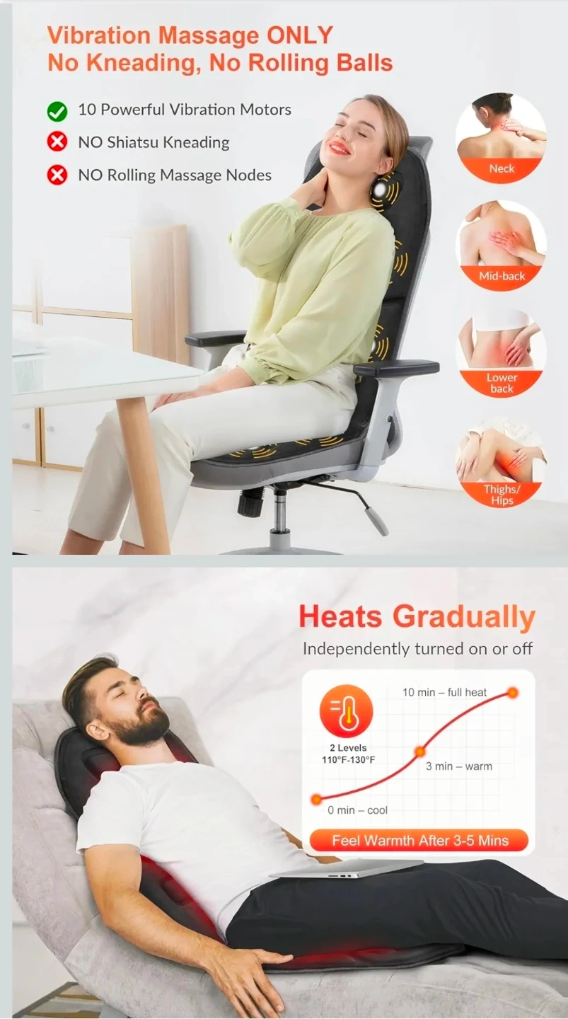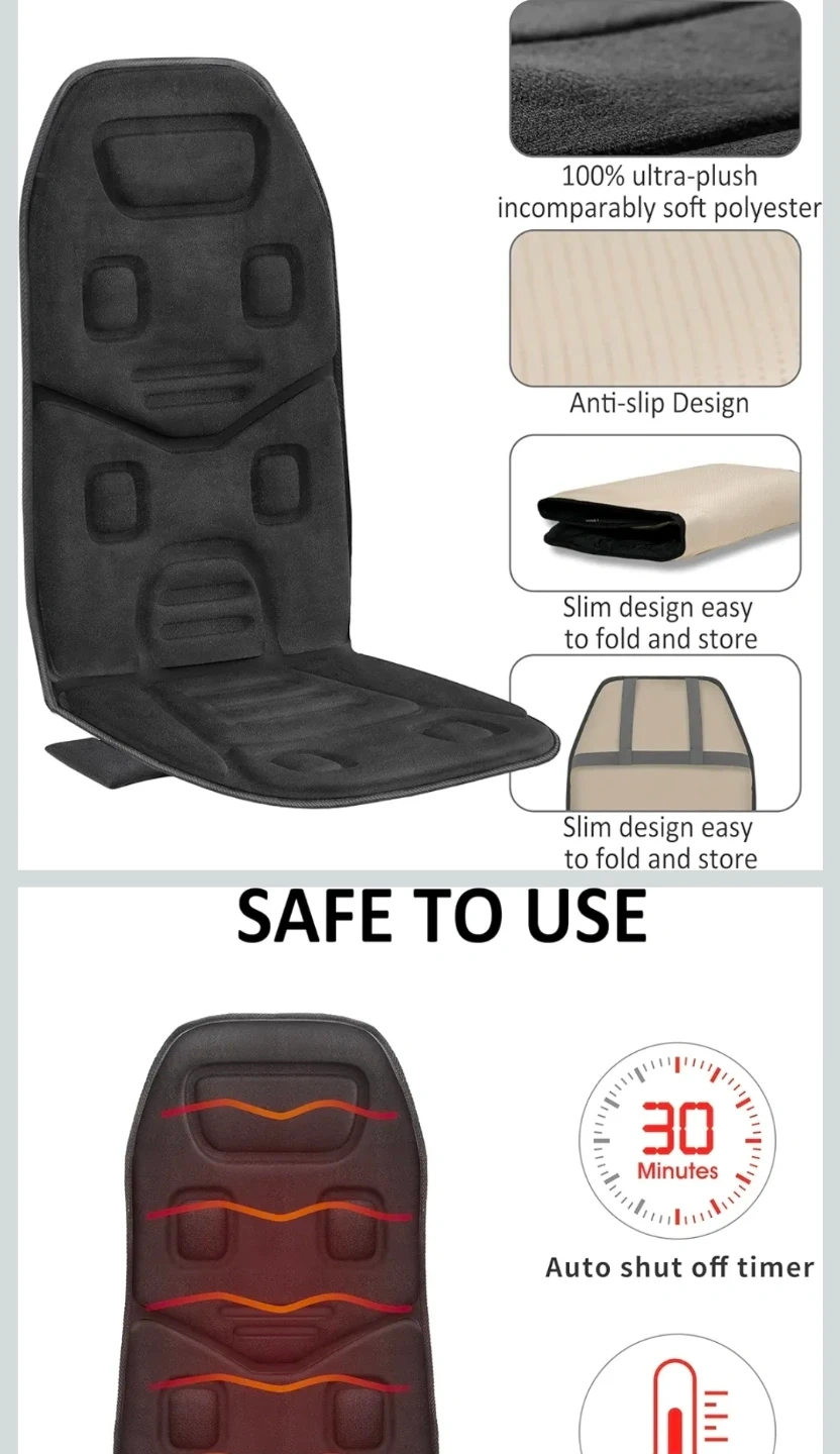 Brand New. This Comfier GF-2206 massage seat cushion has 10 powerful vibration motors and a heating function. It's made of black fabric and includes a controller and power adapter. Dimensions are 17.7 inches wide by 27.5 inches tall.