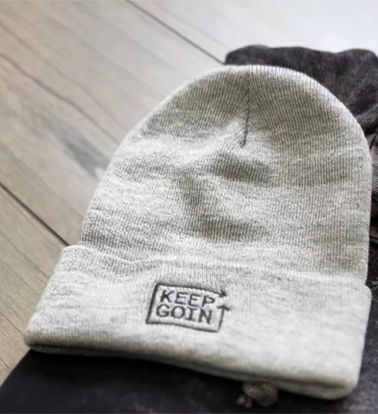Grey Knit Beanie with "Keep Goin'" Logo