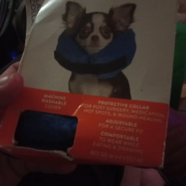 This protective collar is for post-surgery, medication, hot spots, and wound healing. It's adjustable for a secure fit and comfortable to wear while eating & drinking. The neck size is approximately 7.75 in (19.7 cm). It has a machine washable cover.