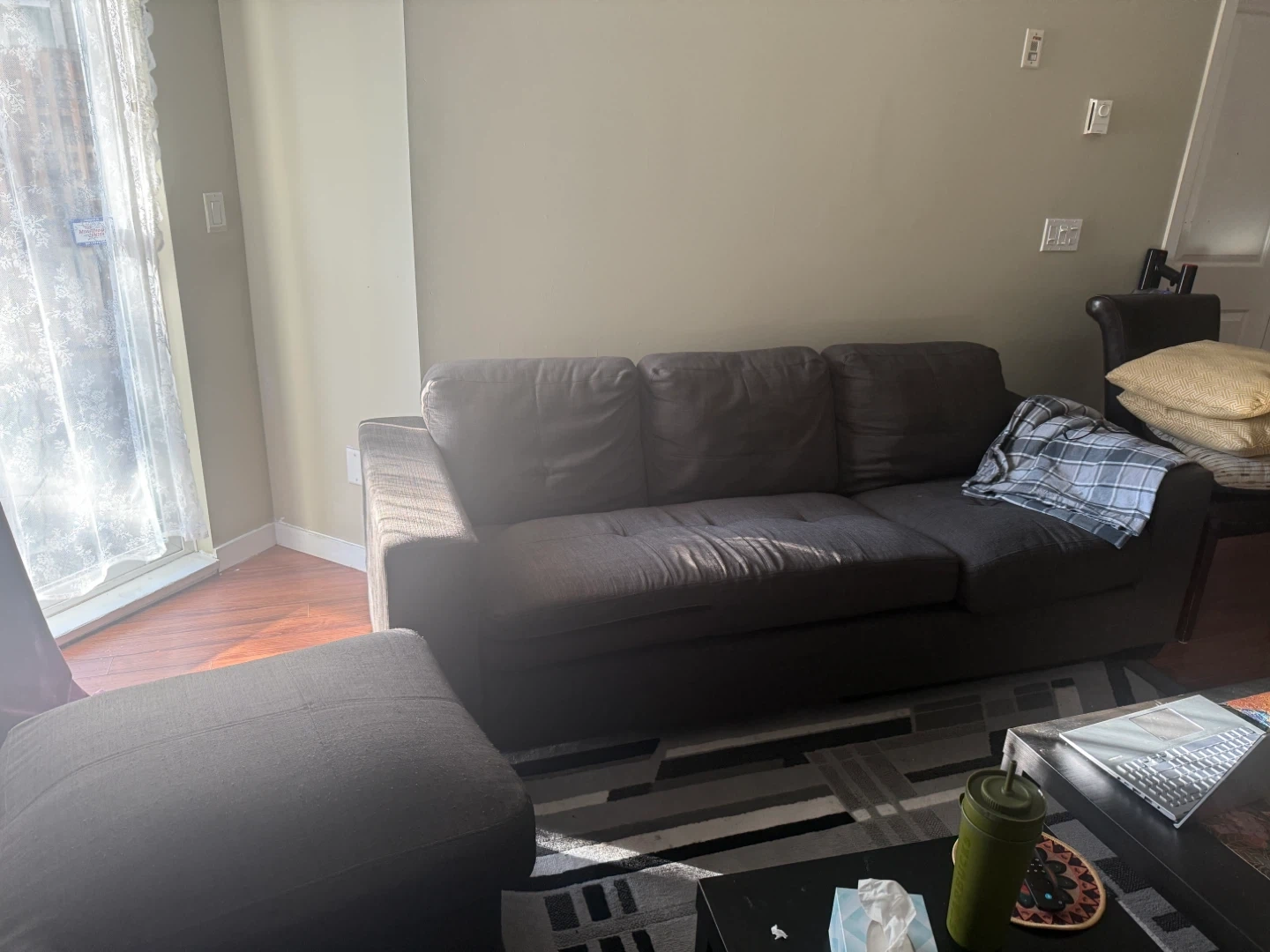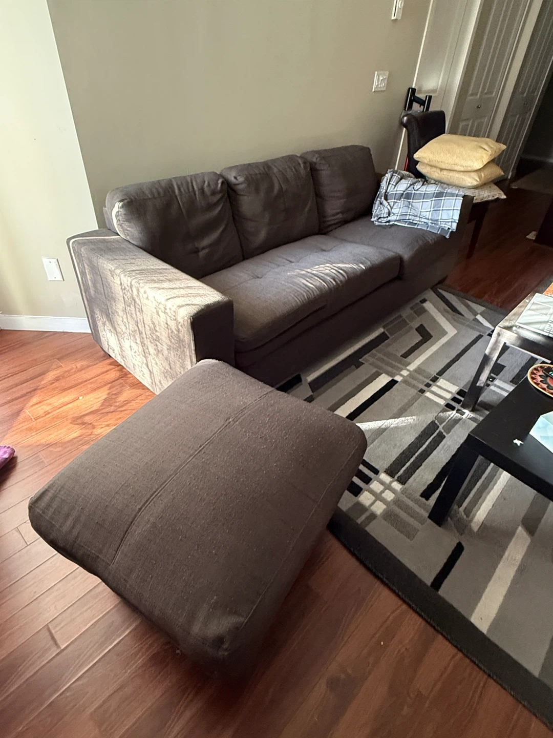 Selling a comfy brown sofa with a matching ottoman! It's a great set for relaxing in your living room. The sofa is in good used condition. Perfect for lounging and movie nights. Can be changed “L” shape sectional sofa with ottoman