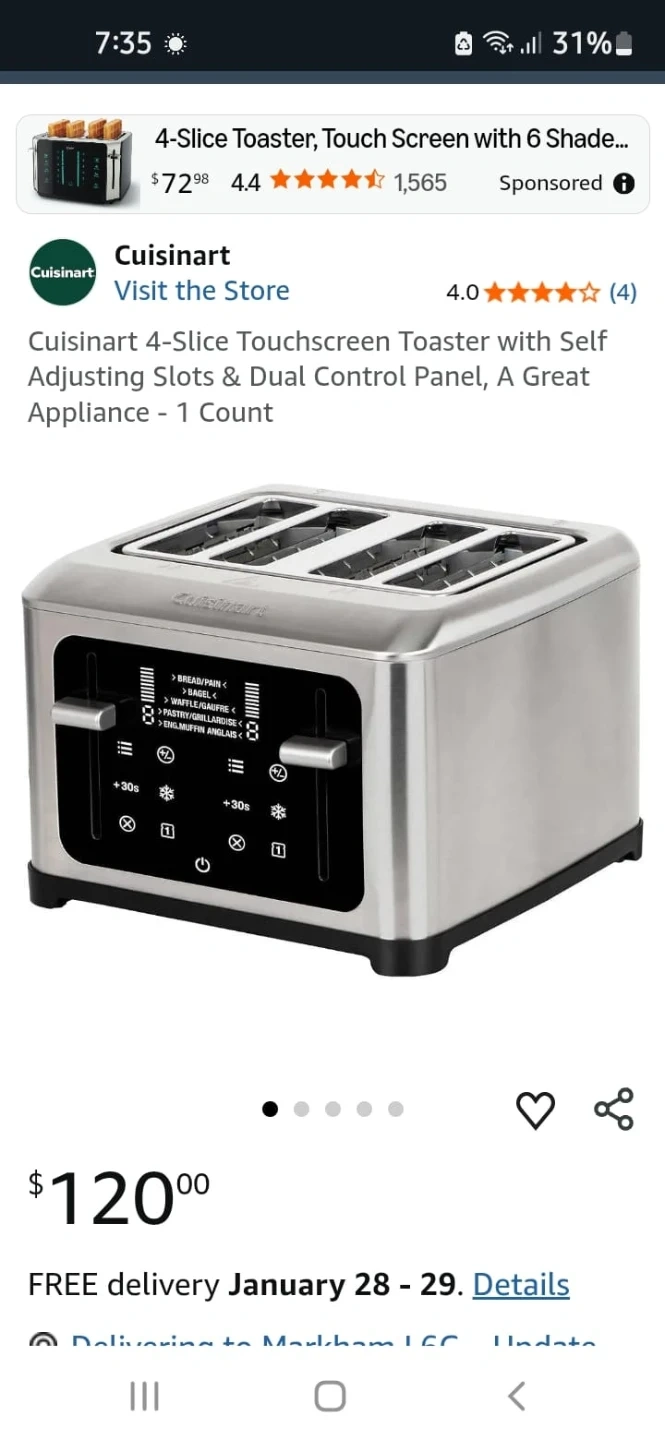 This Cuisinart 4-slice toaster features a digital touchscreen with multiple settings. It has dual control panels for independent toasting on each side. The stainless steel finish looks sharp on any counter. Used but it's very clean and working great.