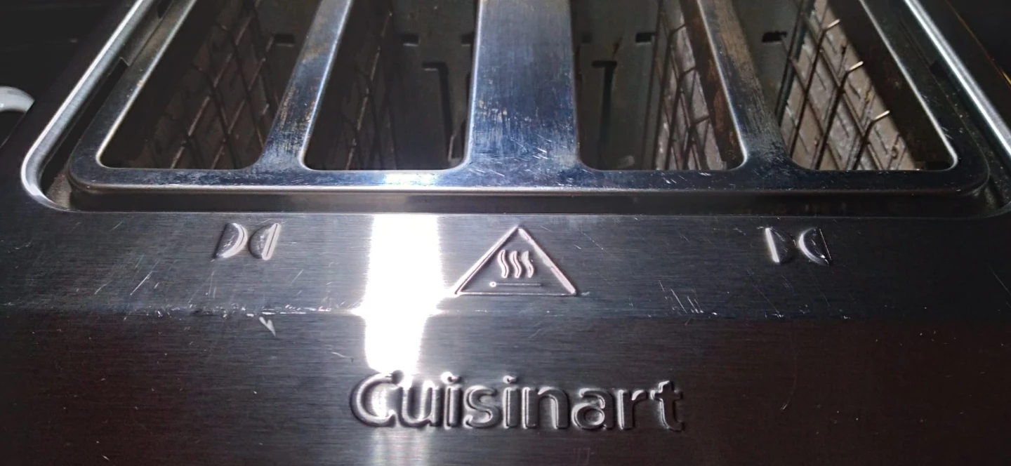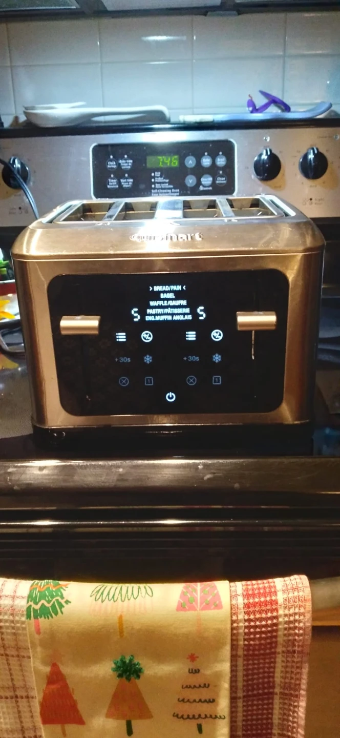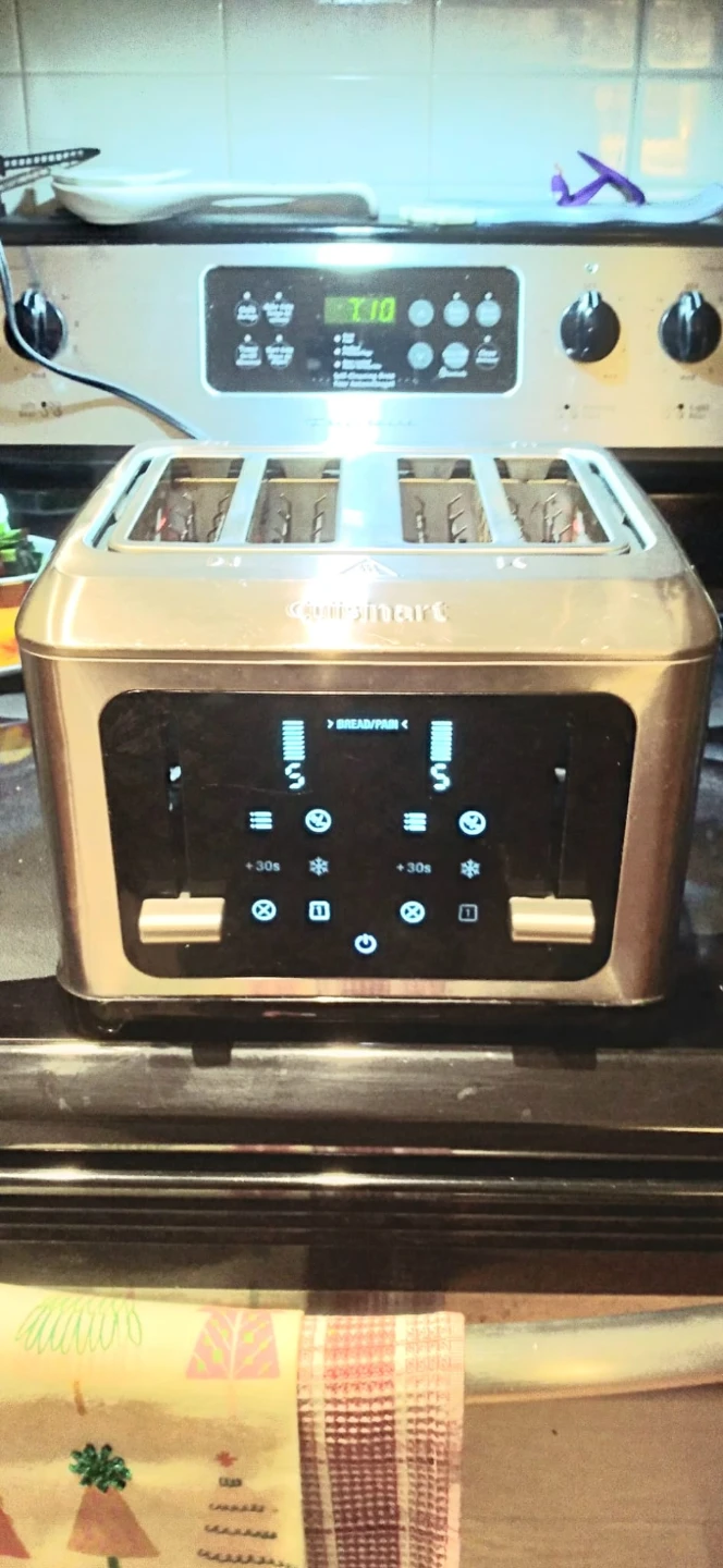 This Cuisinart 4-slice toaster features a digital touchscreen with multiple settings. It has dual control panels for independent toasting on each side. The stainless steel finish looks sharp on any counter. Used but it's very clean and working great.