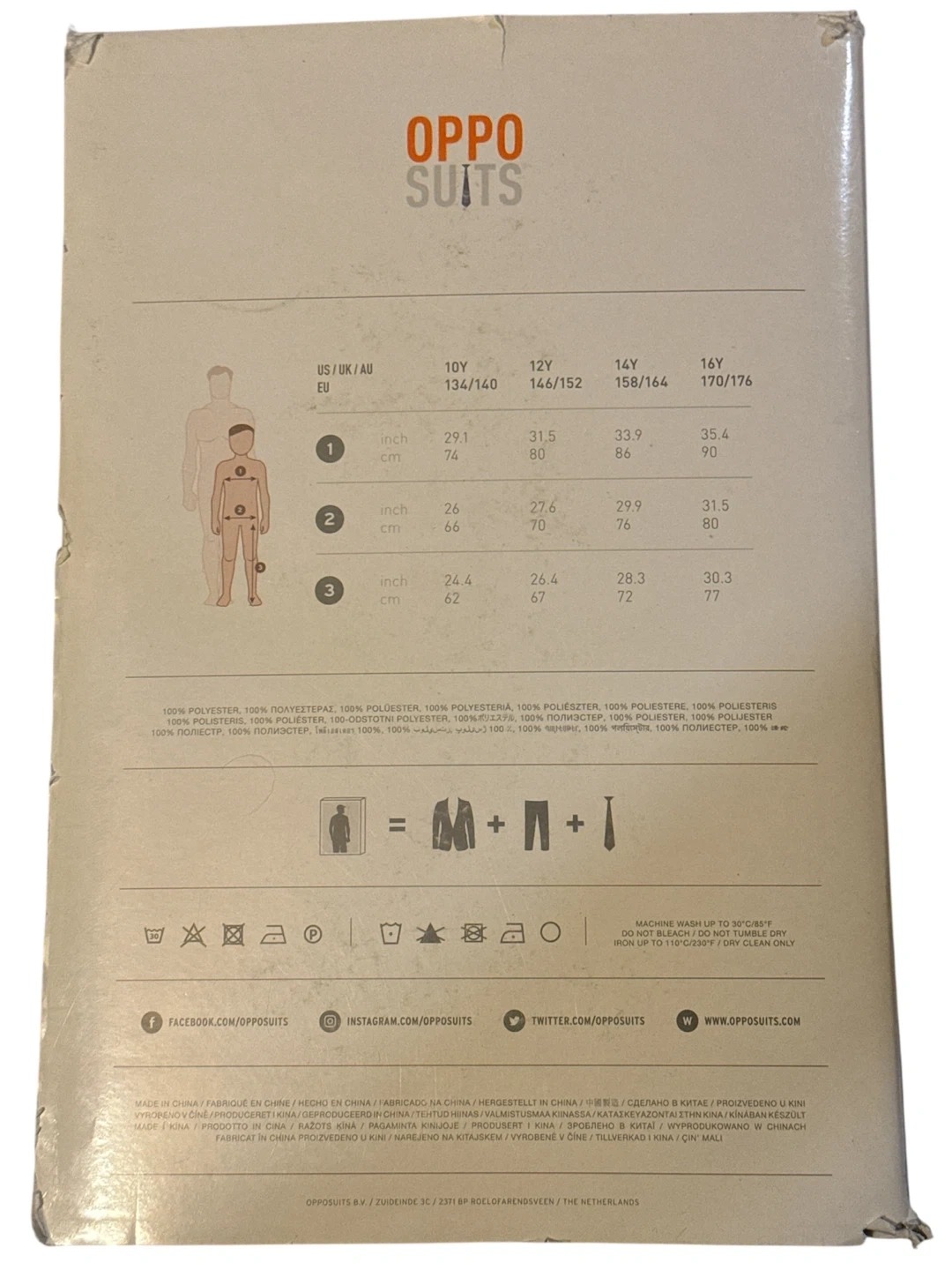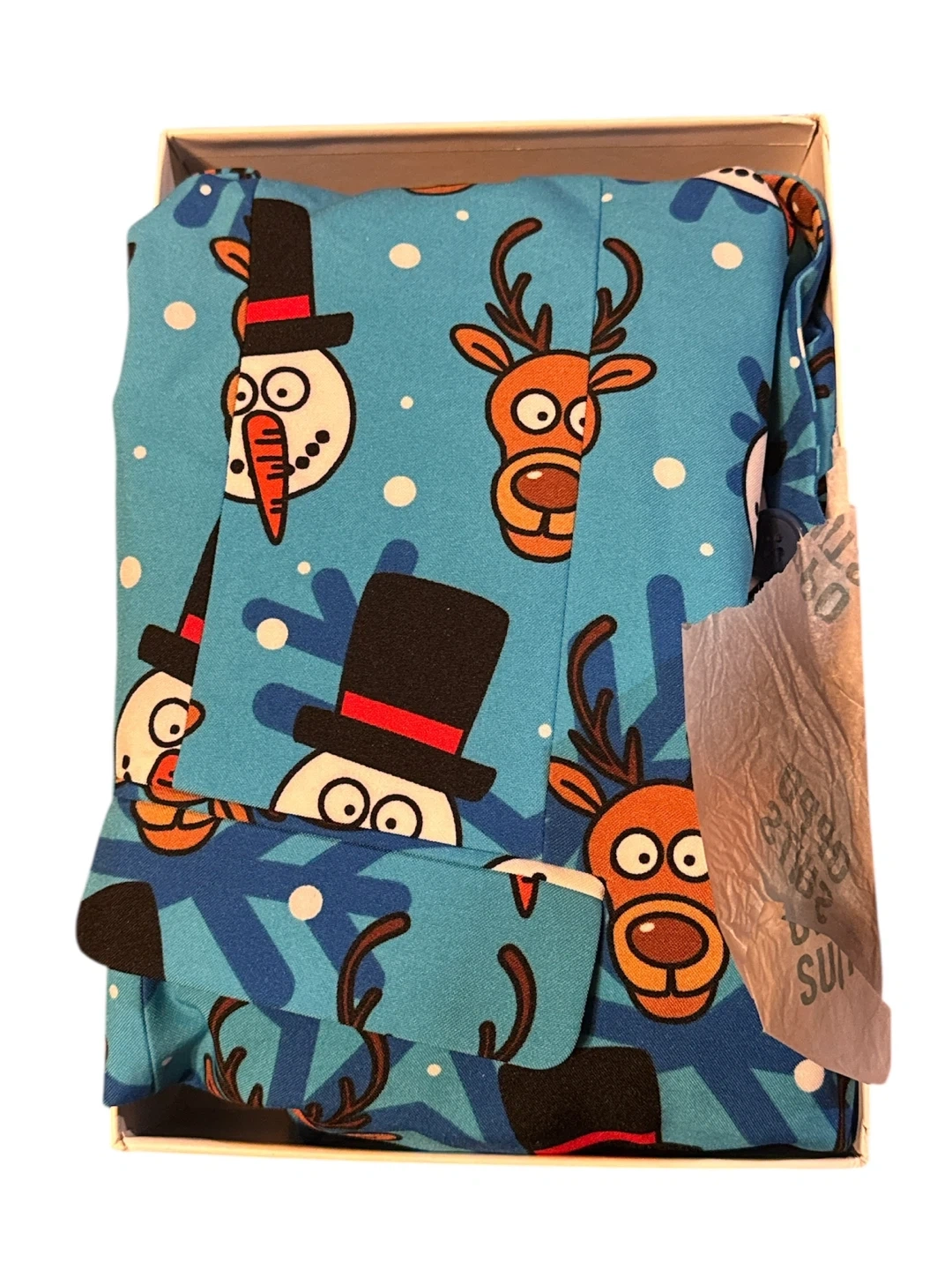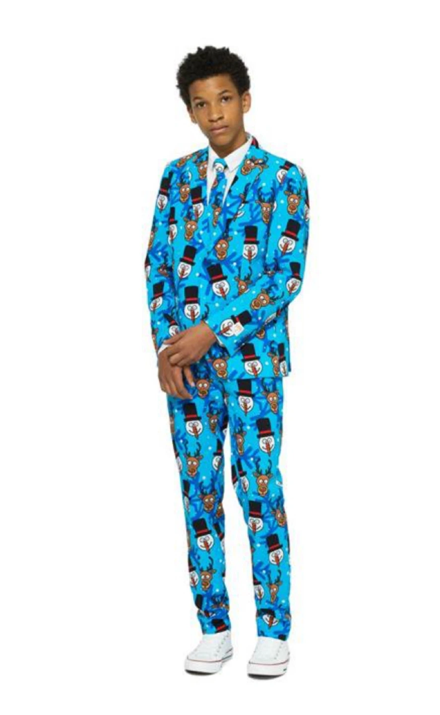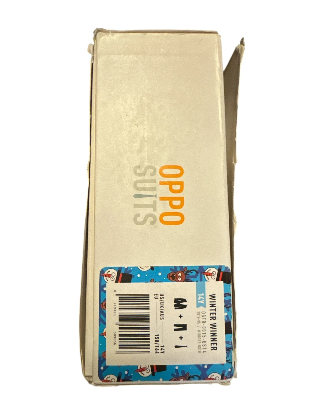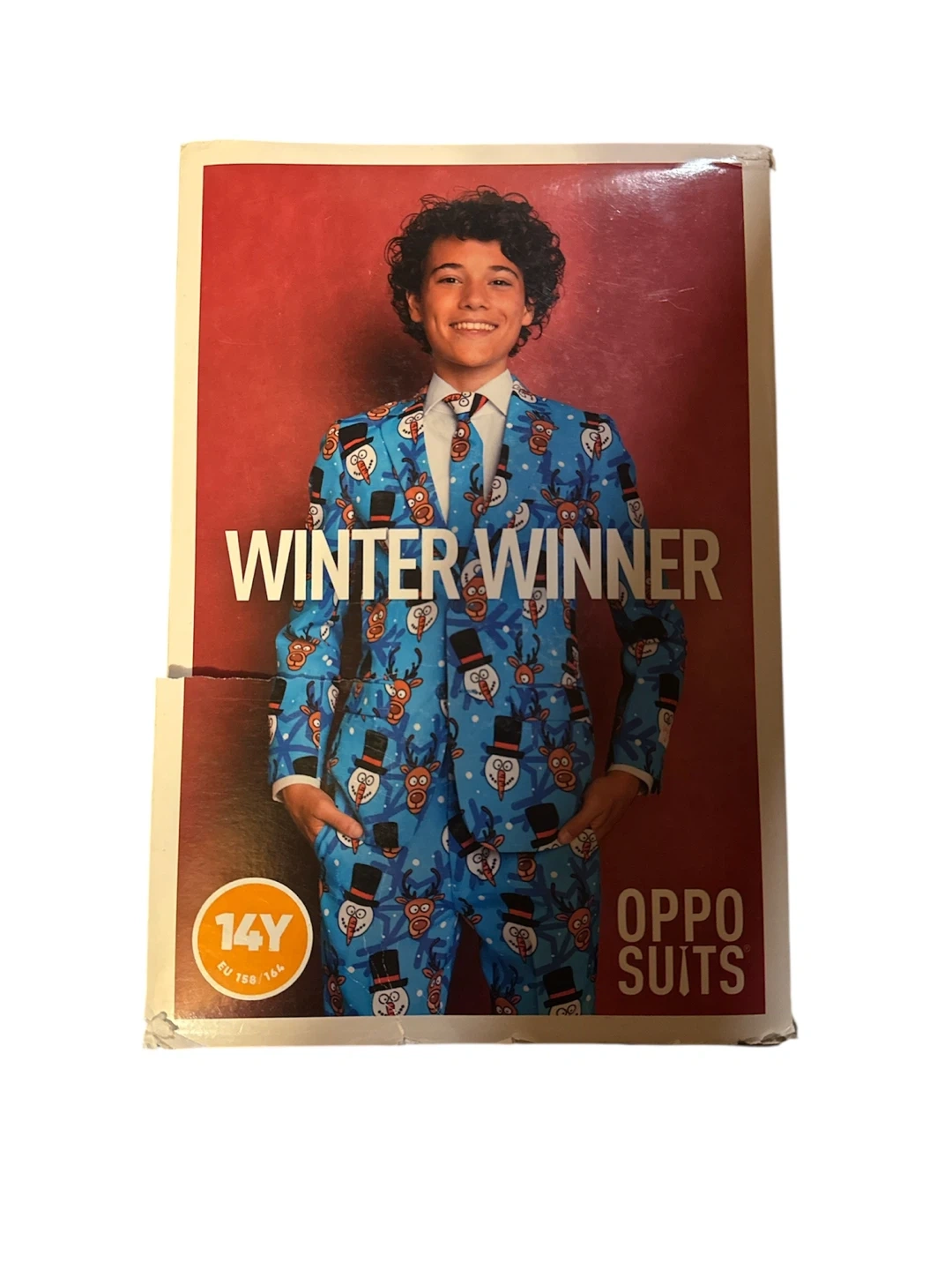 This Oppo Suits "Winter Winner" is a boys' suit. It's a size 14Y. The suit features a blue background with a fun snowman and reindeer pattern. Comes in its original box.