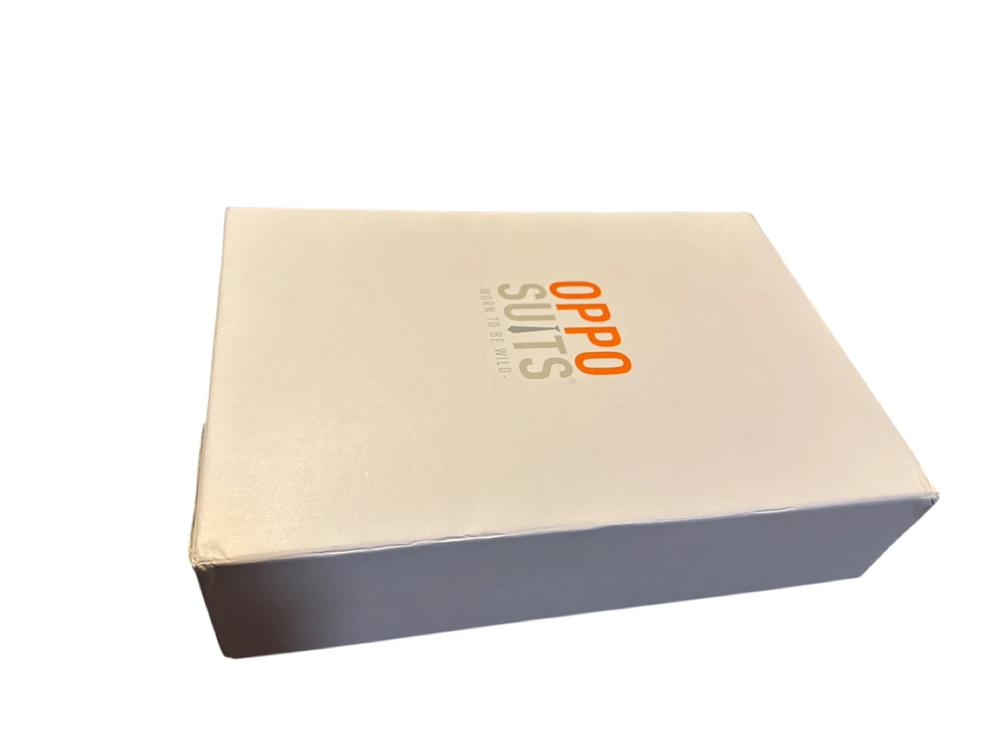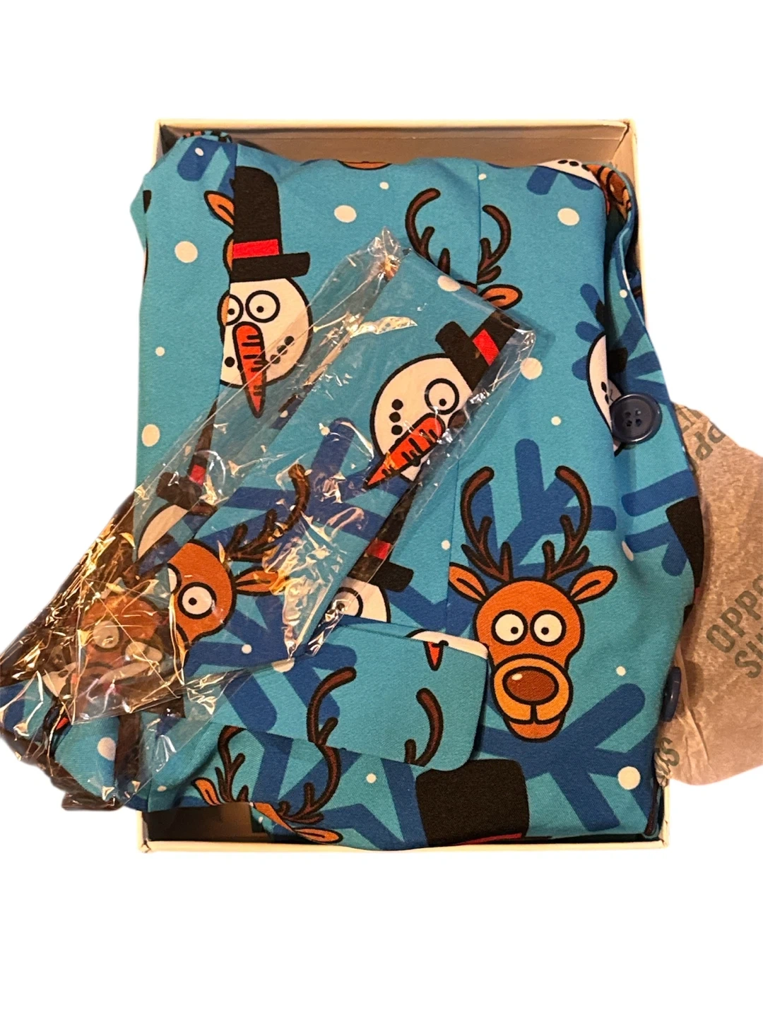 This Oppo Suits "Winter Winner" is a boys' suit. It's a size 14Y. The suit features a blue background with a fun snowman and reindeer pattern. Comes in its original box.