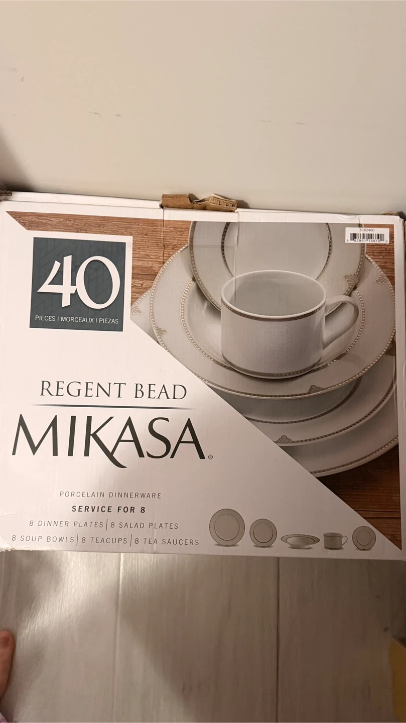 This Mikasa Regent Bead dinnerware set includes 8 dinner plates, 8 salad plates, 8 soup bowls, 8 teacups, and 8 tea saucers. It's made of porcelain. This set provides service for 8 people.