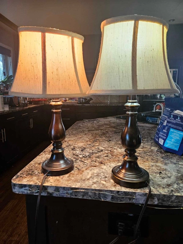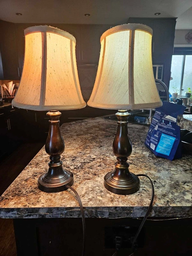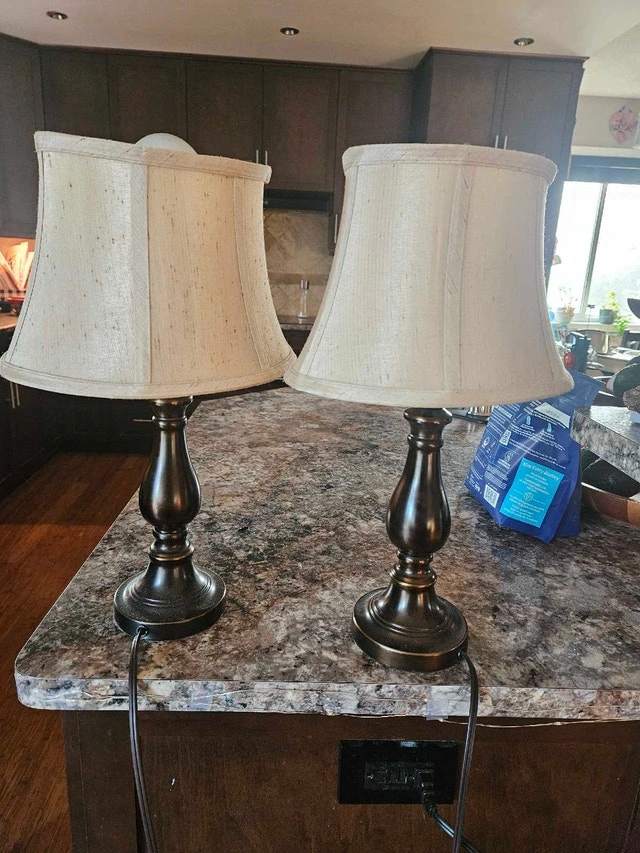Set of 2. 17 inches. Matching pair of classic table lamps with dark bases and neutral fabric shades. Provide a warm, cozy glow and work beautifully on nightstands, side tables, or consoles. Both lamps are in great working condition. A versatile, timeless set. Pickup near Costco
