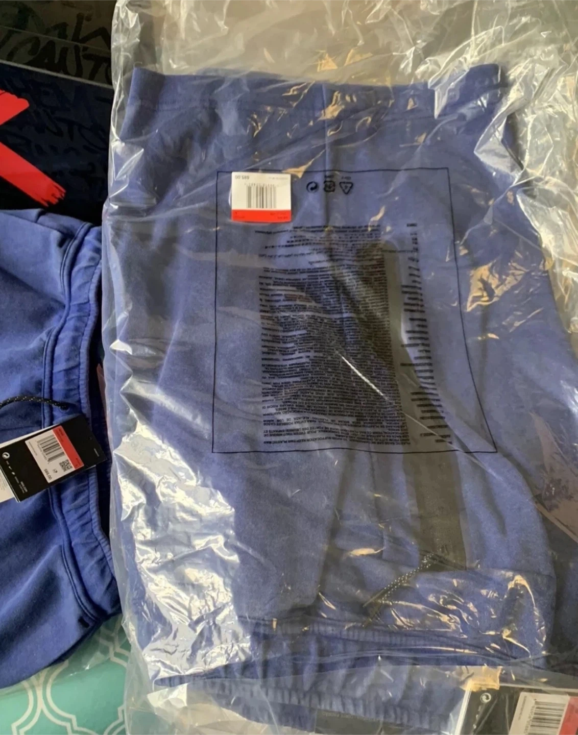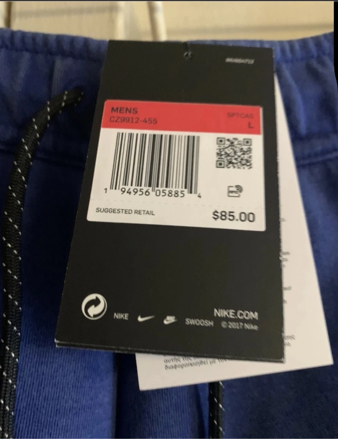 These are Nike men's fleece shorts in a blue color. They're a size large and made in China. Includes original tags.