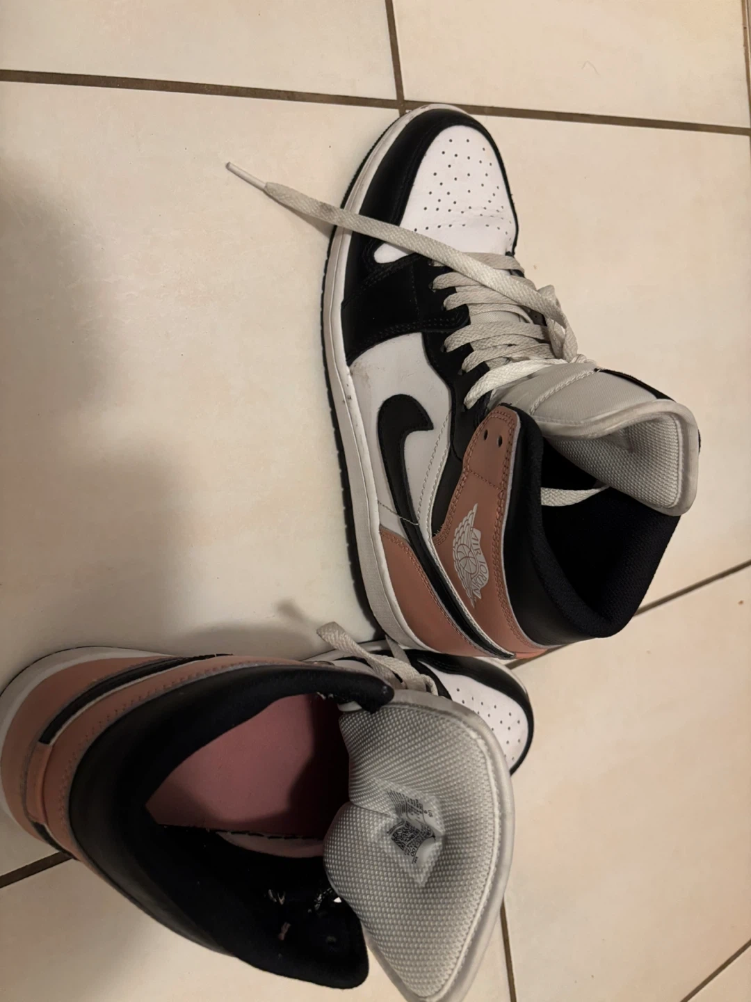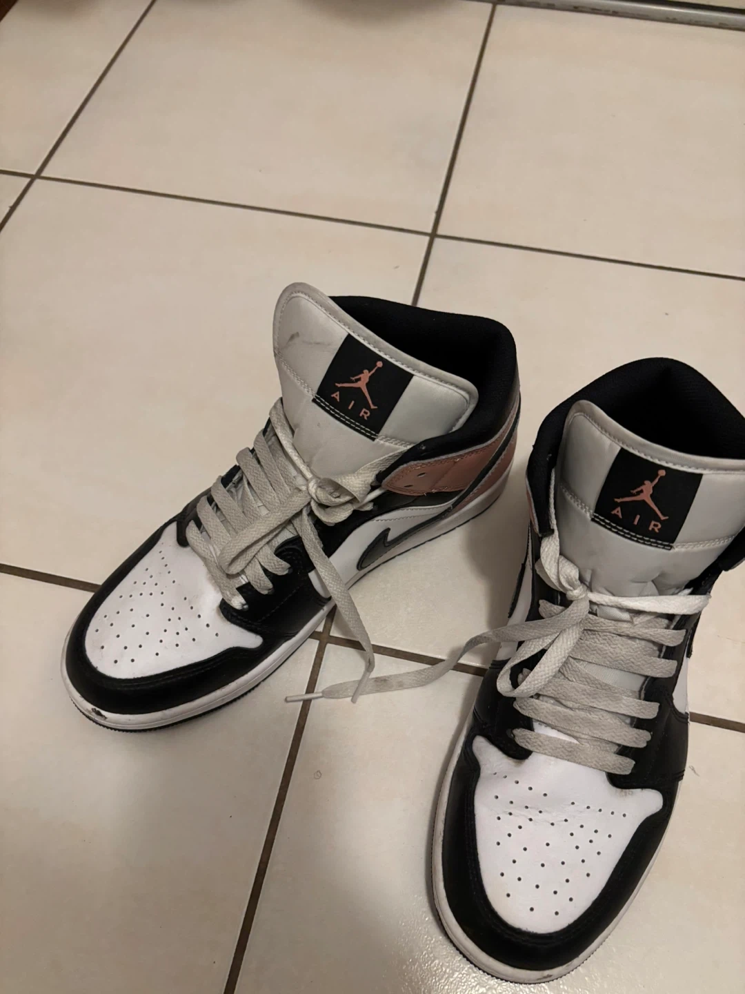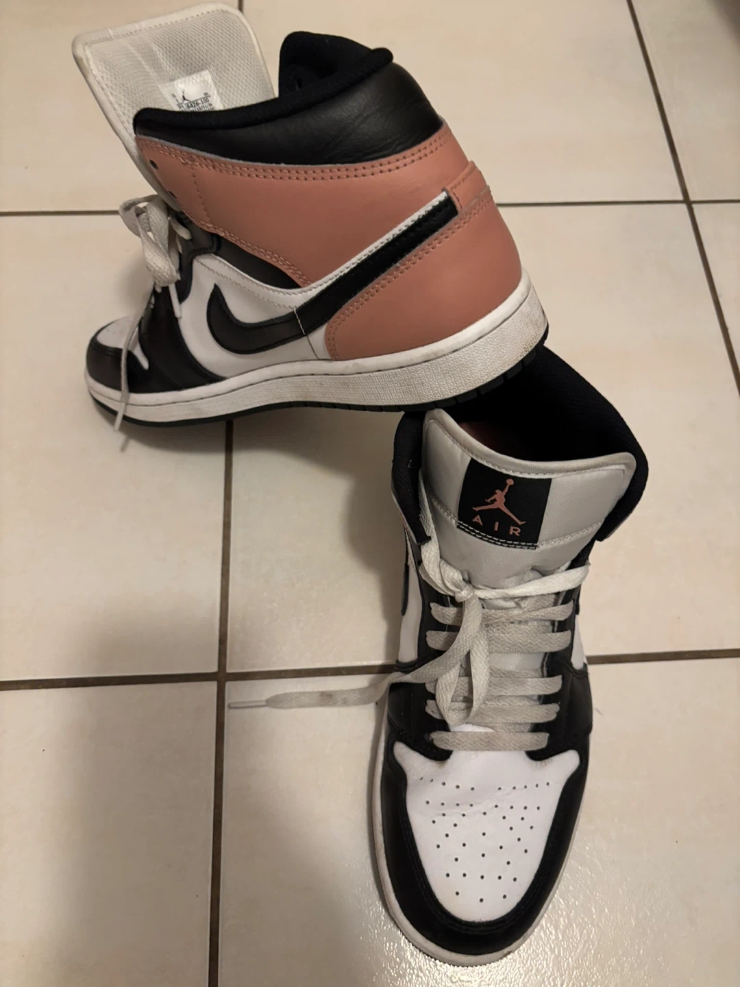 These are Air Jordan 1 Mid SE sneakers. They feature a white, black, and muted coral colourway. Leather upper and rubber outsole.
