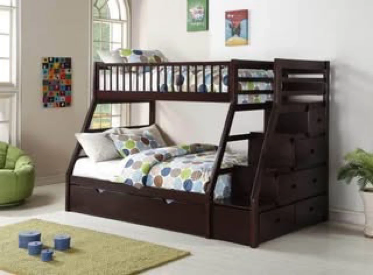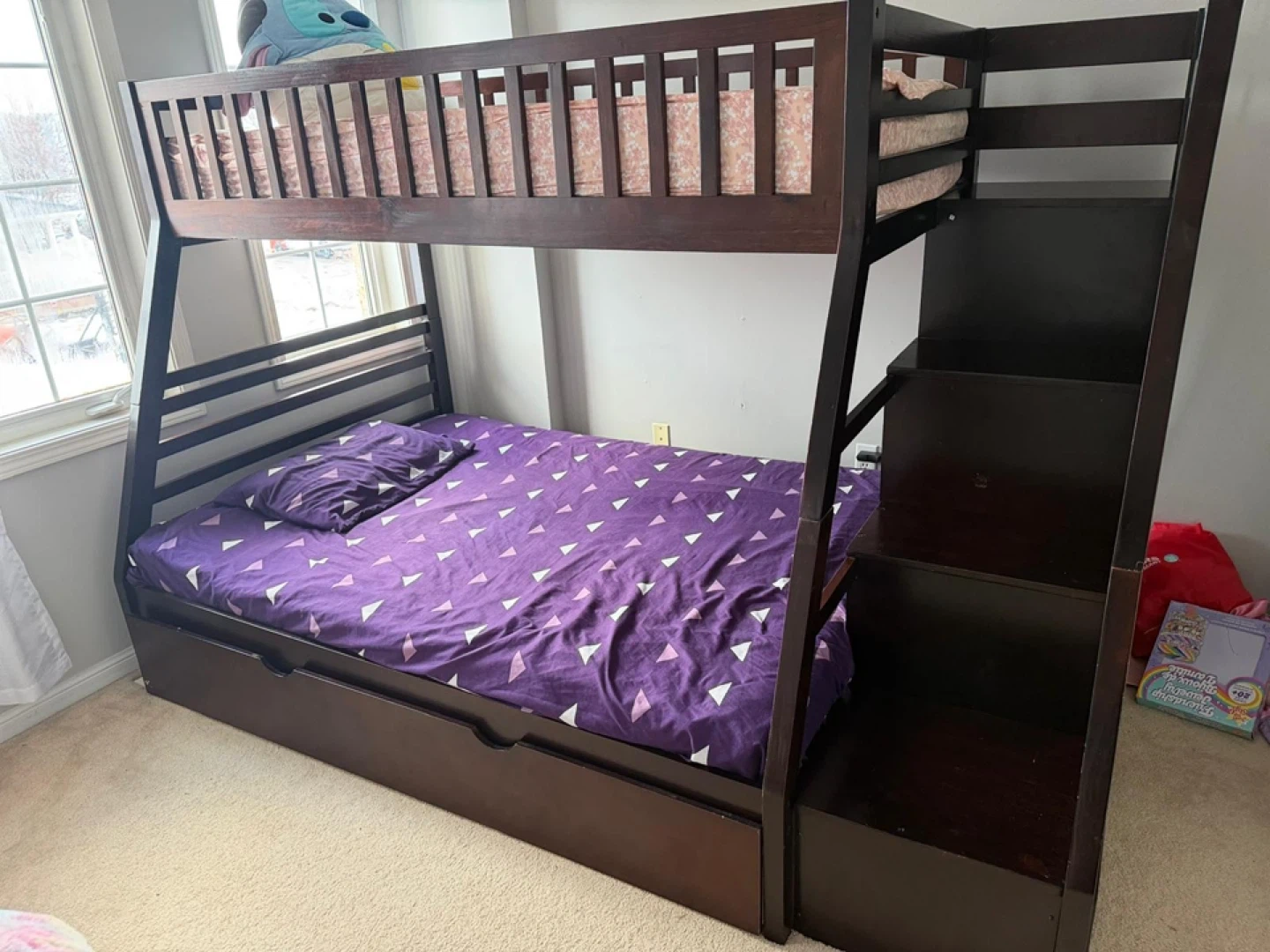 This versatile bunk bed is perfect for kids' rooms, offering sleeping space for two with a pull-out trundle bed. It features convenient storage stairs with drawers for extra organization. The sturdy dark brown wood construction makes it a great space-saving solution.