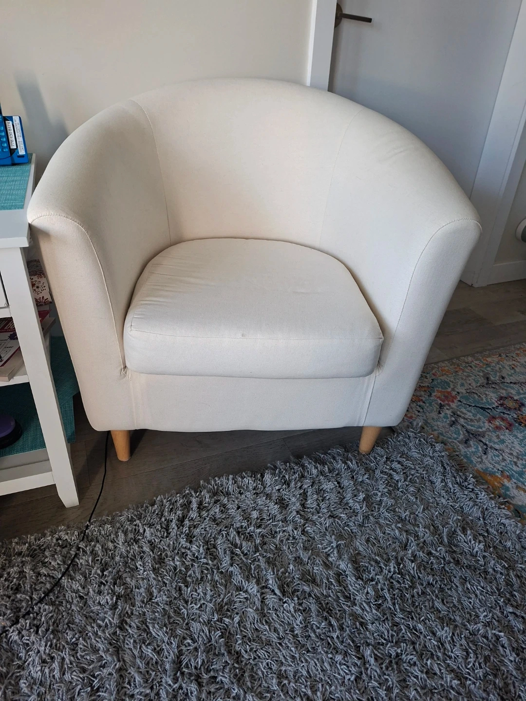 Comfy armchair with a removable teal stretch cover. The chair itself is a neutral cream colour. It's a great way to update your living space or protect your furniture! Measures approximately 30" wide, 32" deep, and 31" high.