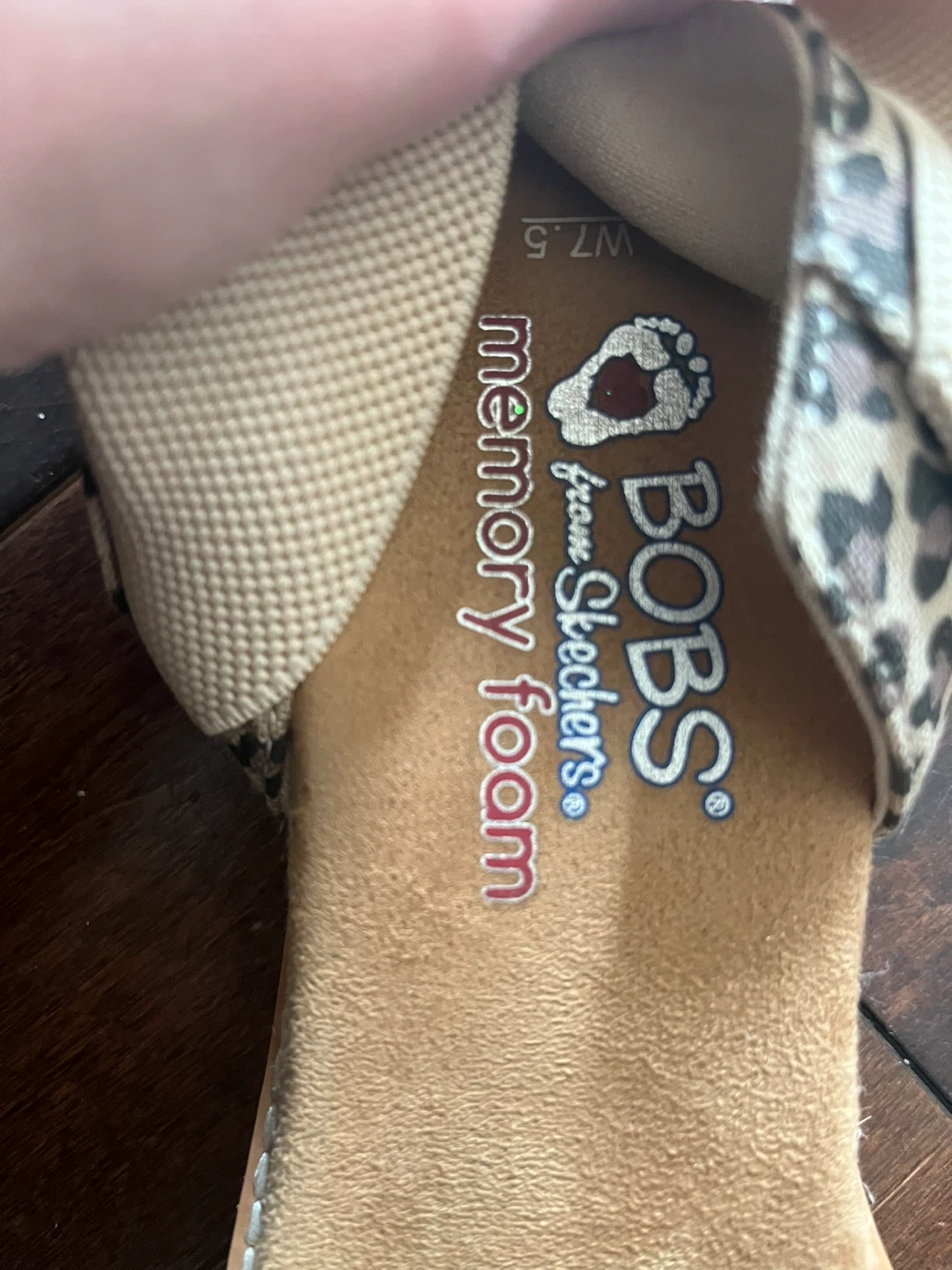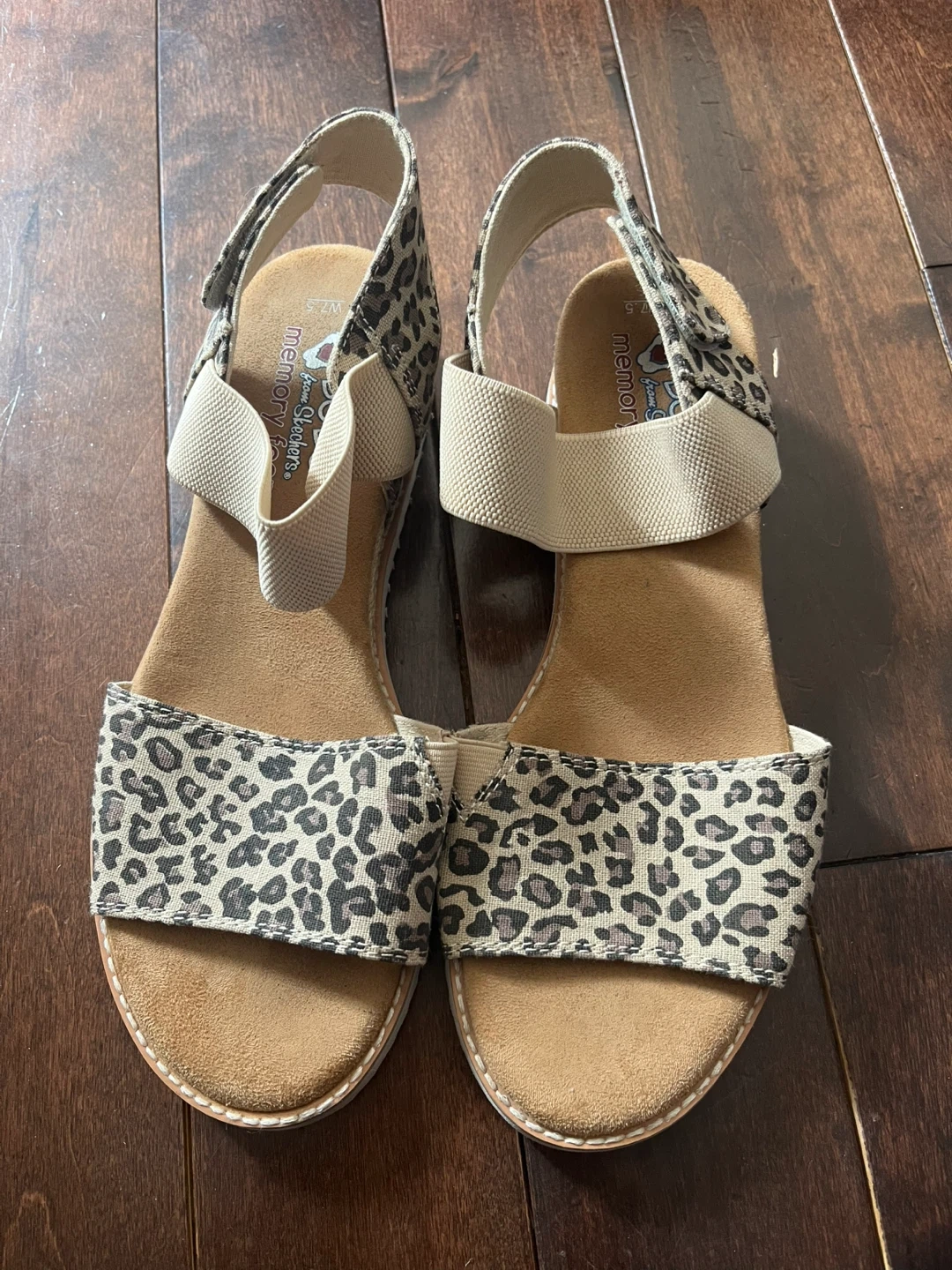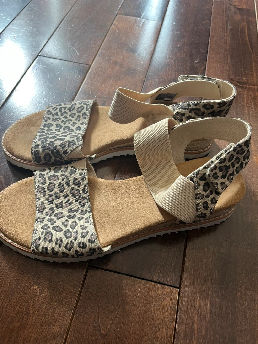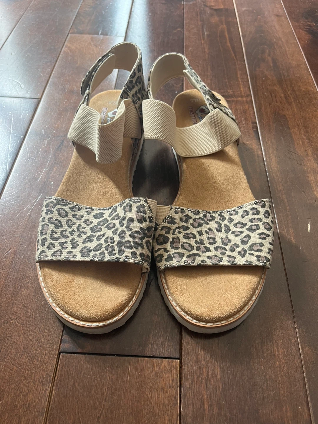 Women's size 7.5 leopard print sandals with elastic straps. Features memory foam insoles for added comfort.