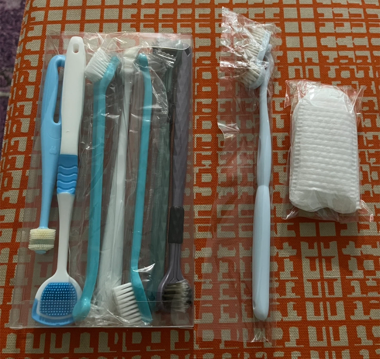 This oral hygiene kit includes several toothbrushes, a tongue scraper, and a cleaning brush. Various styles of brushes are provided for a comprehensive clean. The set comes with a cotton pad for added hygiene.