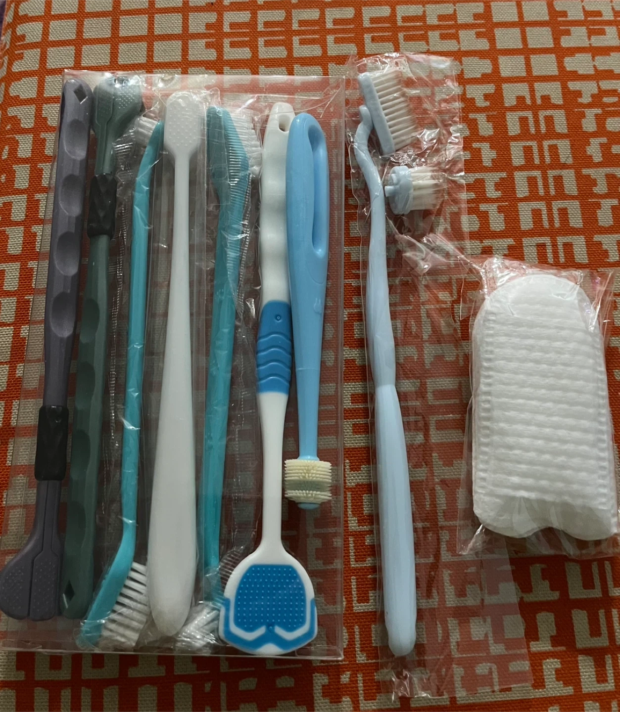 This oral hygiene kit includes several toothbrushes, a tongue scraper, and a cleaning brush. Various styles of brushes are provided for a comprehensive clean. The set comes with a cotton pad for added hygiene.