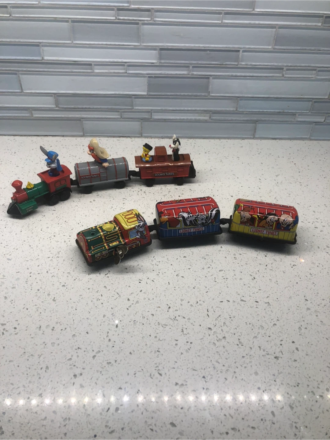 This is a vintage Looney Tunes tin wind-up train set. It features classic characters from the cartoon. The train cars are connected and appear to be made of tin. Dye cast looney tunes train in great shape