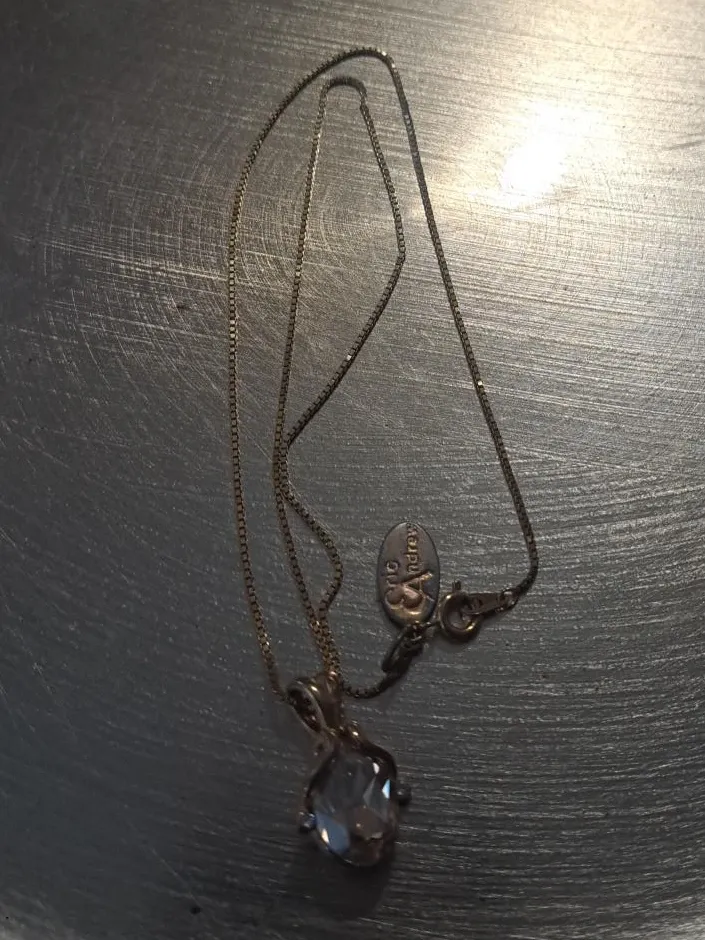 Beautiful Eric Andrew necklace with a clear gemstone pendant. The chain is a delicate box style. This piece adds a touch of sparkle to any outfit!