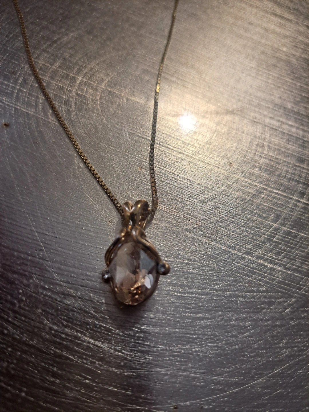 Beautiful Eric Andrew necklace with a clear gemstone pendant. The chain is a delicate box style. This piece adds a touch of sparkle to any outfit!