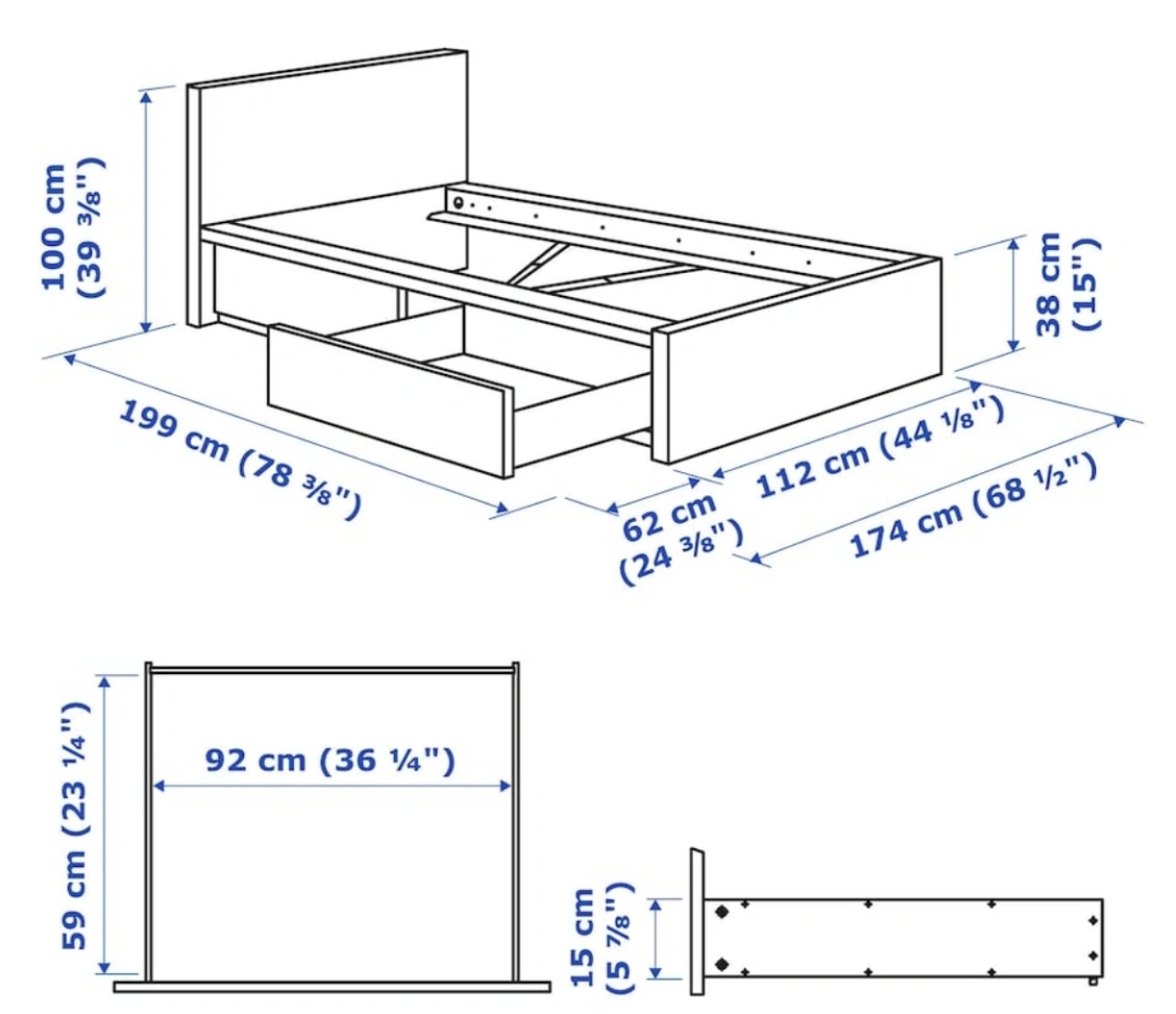 high bed frame with storage boxes, black-brown, color, high headboard, like new, 28 months old, IKEA LUROY slatted bed base and 2 underbed storage boxes included. mattress excluded. disassembly may be required.