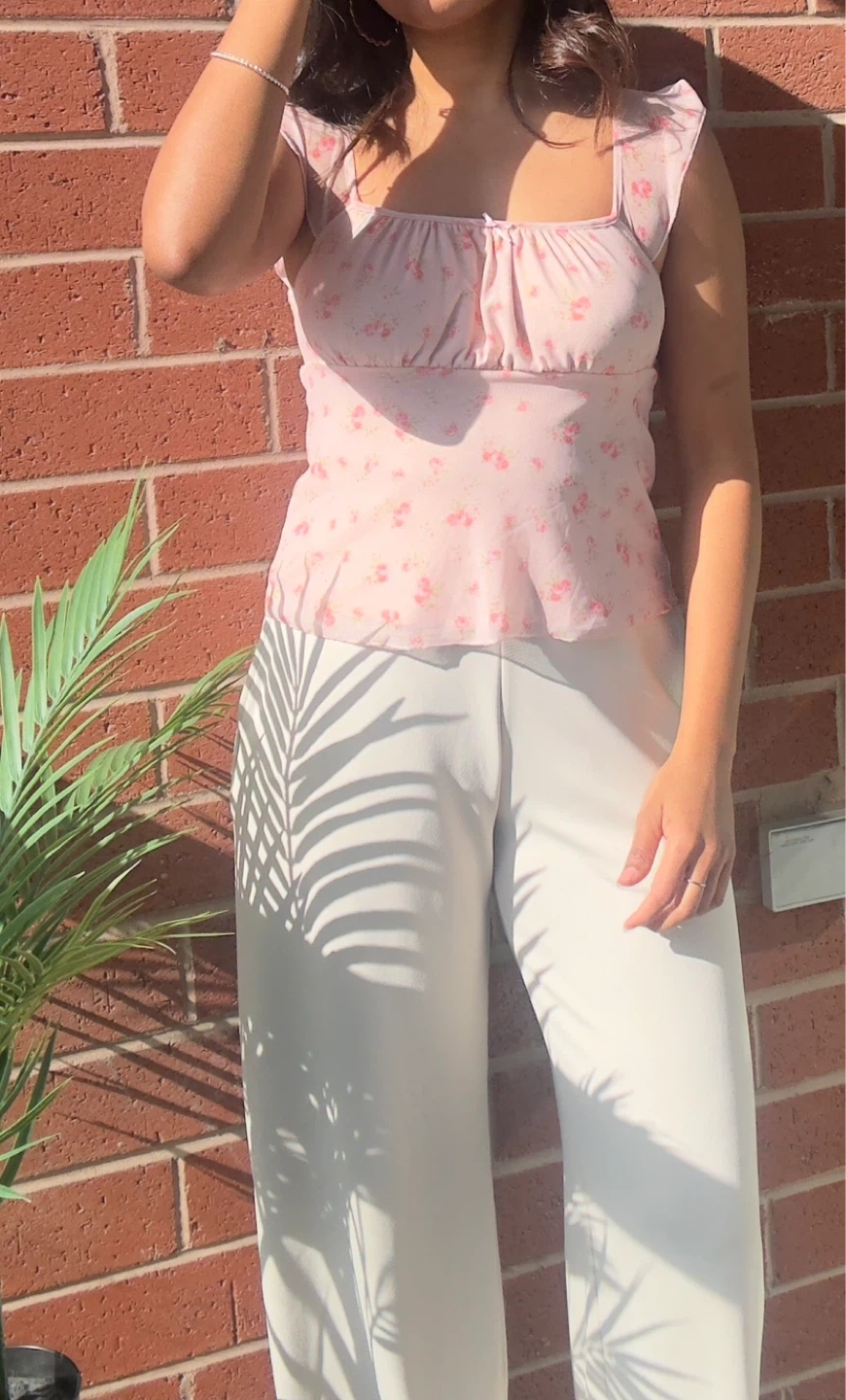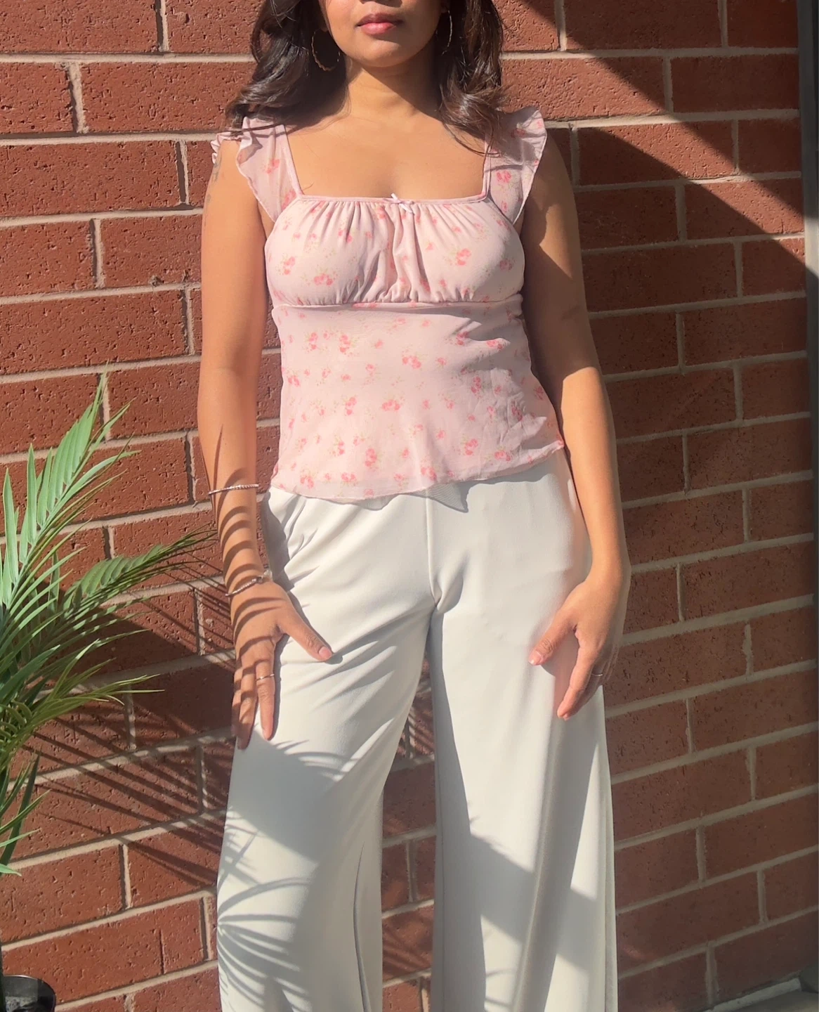 This is a cute pink floral print tank top. It has a square neckline with a smocked bodice and a sweet little bow detail. The ruffled cap sleeves add a feminine touch. It's made of a lightweight, sheer material.