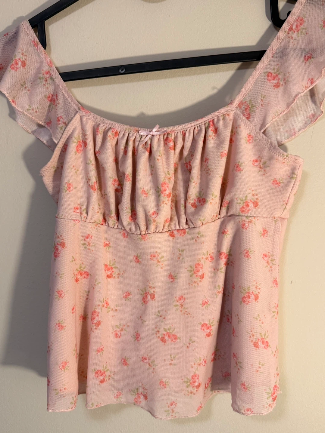 This is a cute pink floral print tank top. It has a square neckline with a smocked bodice and a sweet little bow detail. The ruffled cap sleeves add a feminine touch. It's made of a lightweight, sheer material.