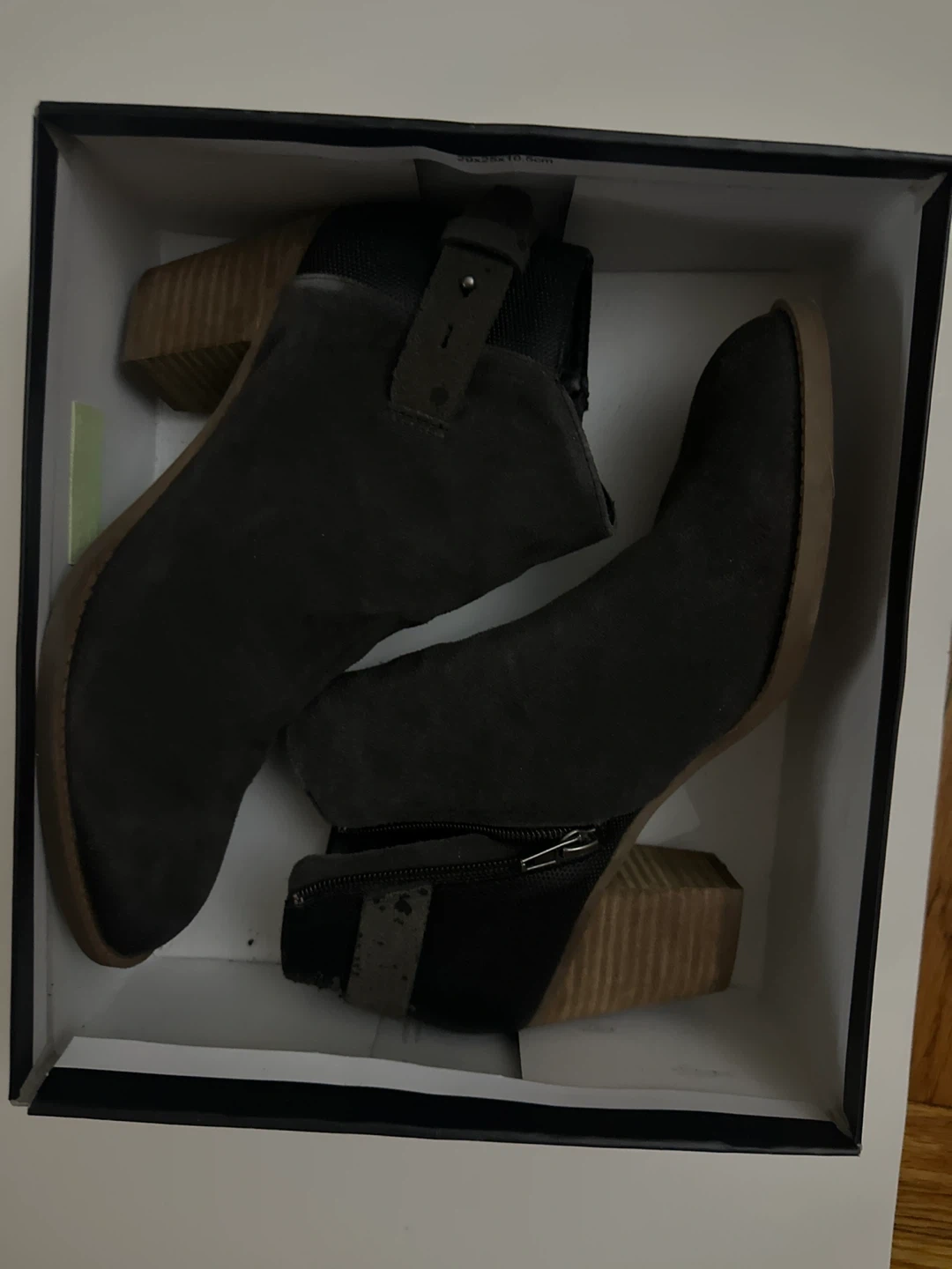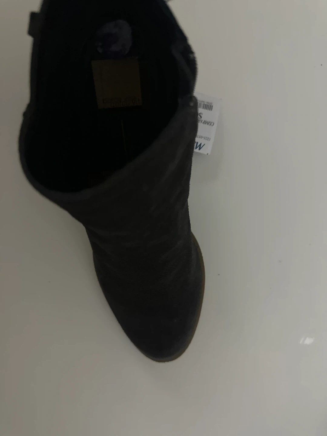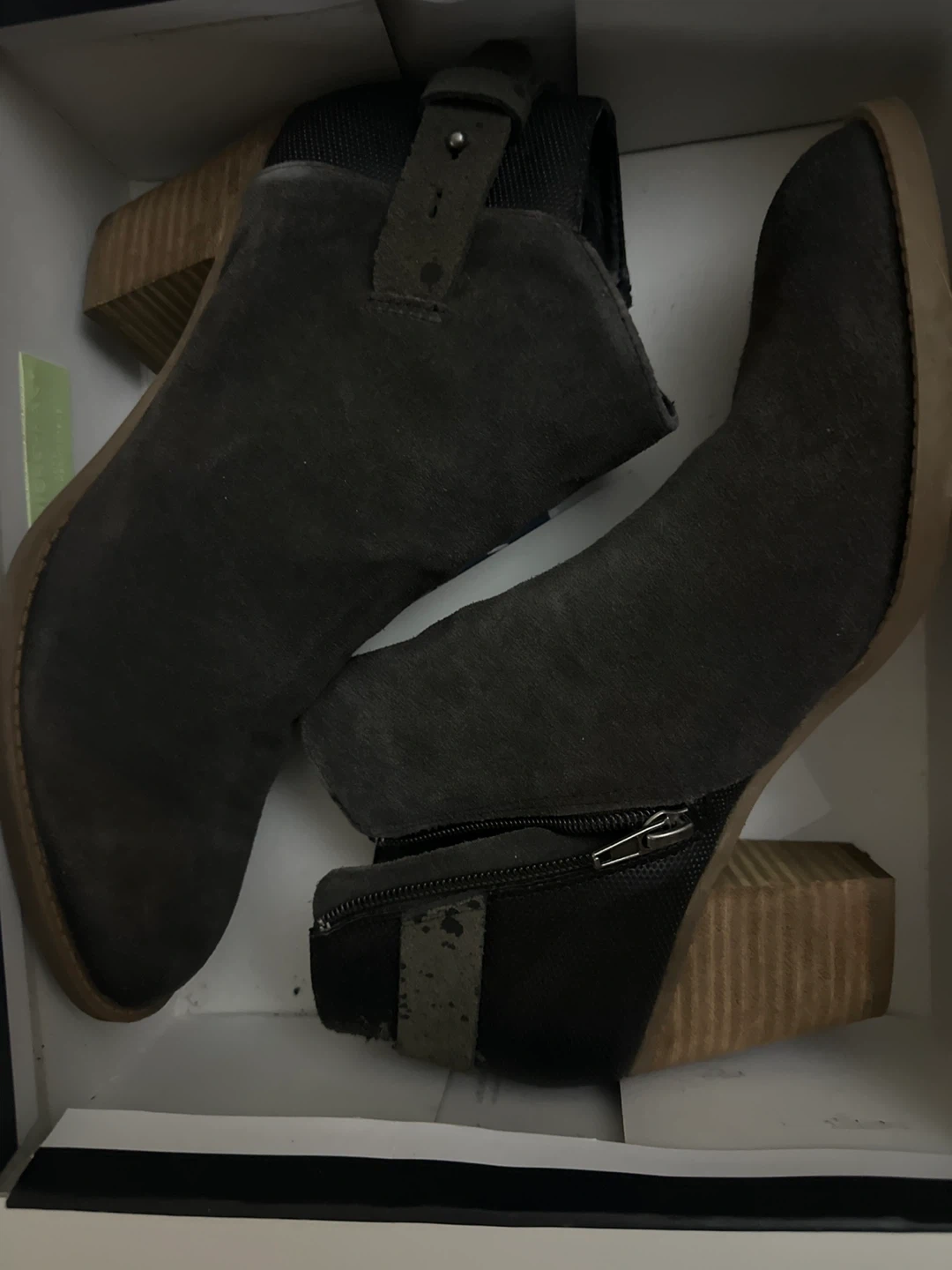 Women's ankle boots by Kelly & Katie in a size small. These stylish boots feature a side zipper and a stacked block heel. They're made from a dark gray suede-like material and come in the original box.