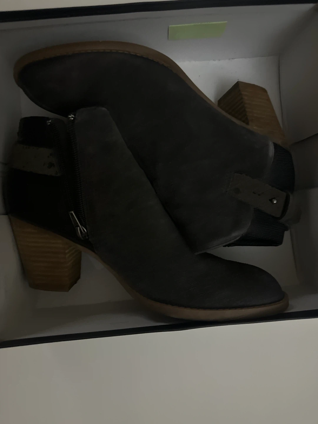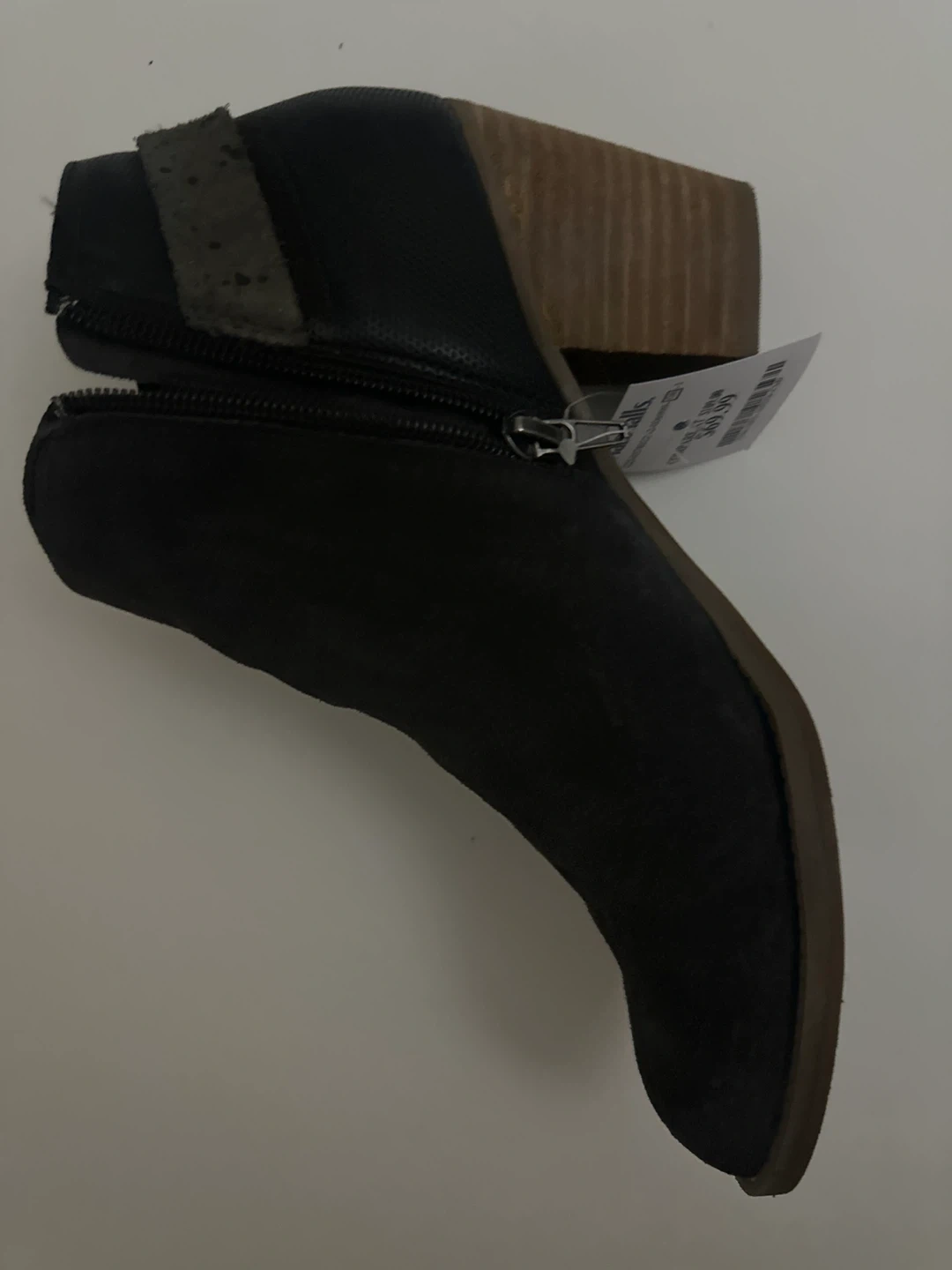Women's ankle boots by Kelly & Katie in a size small. These stylish boots feature a side zipper and a stacked block heel. They're made from a dark gray suede-like material and come in the original box.
