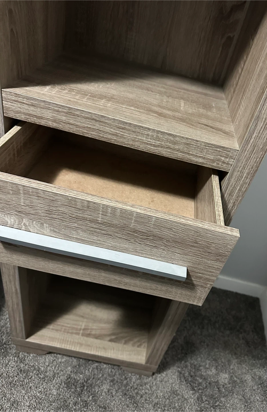 I'm selling two shelving units with drawers, perfect for adding storage space to any room. They're in good condition and ready to use. The light brown wood finish is neutral and goes with many decorating styles. Feel free to contact me if you have any questions!