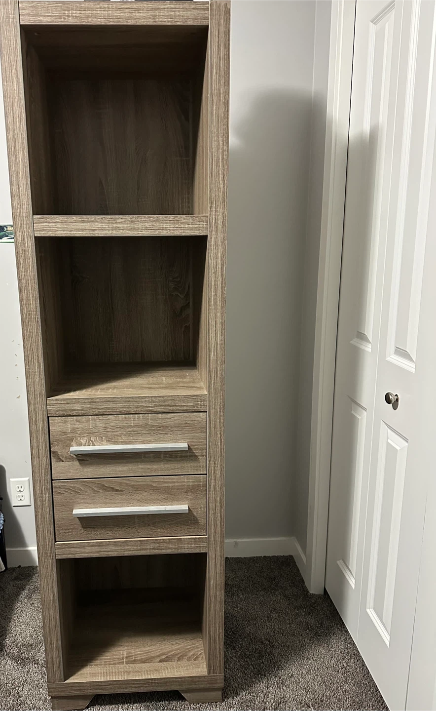 I'm selling two shelving units with drawers, perfect for adding storage space to any room. They're in good condition and ready to use. The light brown wood finish is neutral and goes with many decorating styles. Feel free to contact me if you have any questions!