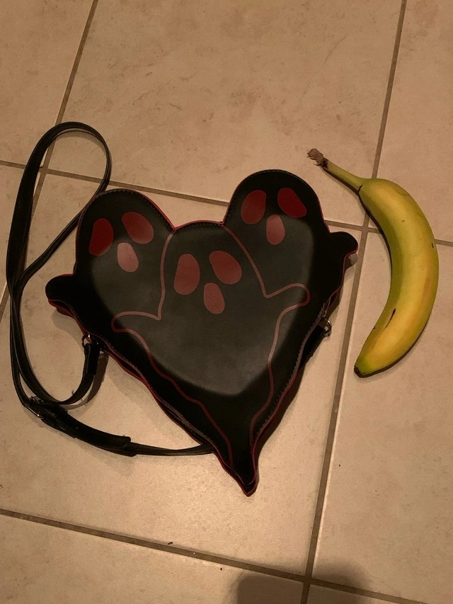 This Spirit Halloween purse is the perfect spooky accessory, featuring a unique ghost design with red accents and a convenient shoulder strap. Banana for scale lol